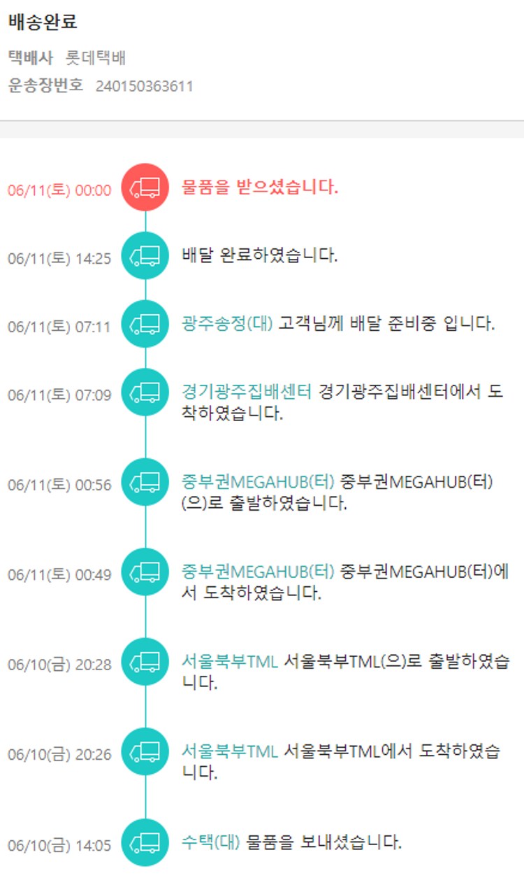 기부자님이 사용한 기부포인트 29,900원, 결제 수수료 11,323원, 기타 사업비는 행복나눔재단이 부담했습니다. (기부후기 발송시점에 최종 업데이트 됩니다.) 실제 쇼핑몰에서 확인되는 배송현황을 캡처한 내용입니다. 실시간 자료와는 차이가 있을 수 있습니다.
