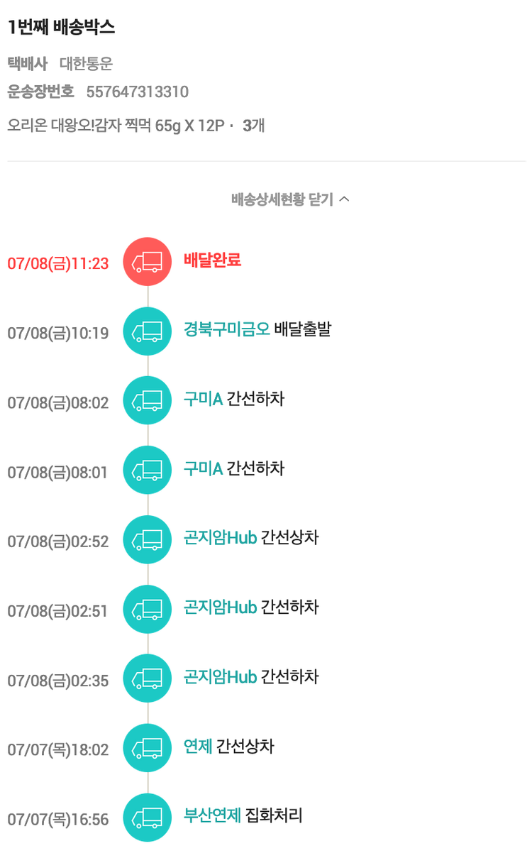 기부자님이 사용한 기부포인트 6,700원, 100원 미만 지원금 40원, 결제 수수료 12,104원, 기타 사업비는 행복나눔재단이 부담했습니다. (기부후기 발송시점에 최종 업데이트 됩니다.) 실제 쇼핑몰에서 확인되는 배송현황을 캡처한 내용입니다. 실시간 자료와는 차이가 있을 수 있습니다.
