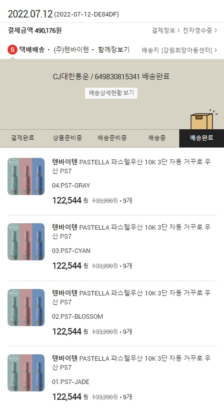 기부자님이 사용한 기부포인트 39,600원, 100원 미만 지원금 76원, 결제 수수료 10,759원, 기타 사업비는 행복나눔재단이 부담했습니다. (기부후기 발송시점에 최종 업데이트 됩니다.) 실제 쇼핑몰에서 확인되는 배송현황을 캡처한 내용입니다. 실시간 자료와는 차이가 있을 수 있습니다.