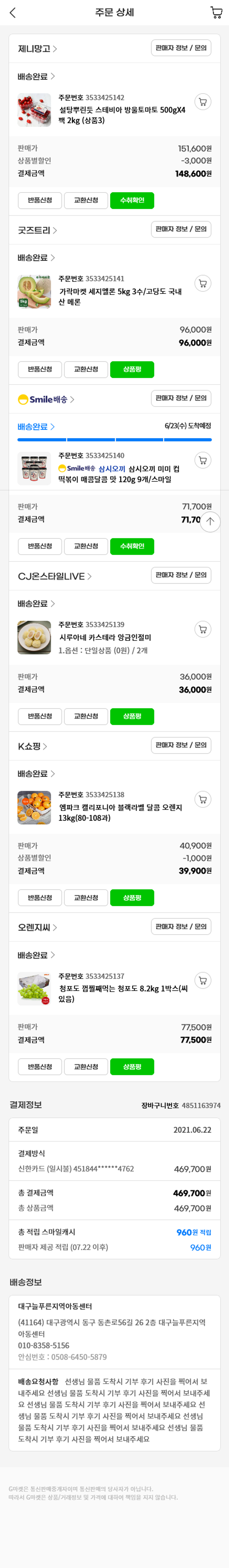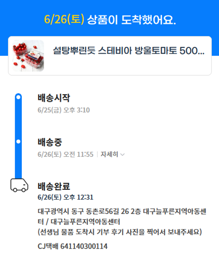기부자님이 사용한 기부포인트 54,500원, 가격상승분 6,950원, 100원 미만 지원금 50원, 결제 수수료 13,216원, 기타 사업비는 행복나눔재단이 부담했습니다. (기부후기 발송시점에 최종 업데이트 됩니다.) 실제 쇼핑몰에서 확인되는 배송현황을 캡처한 내용입니다. 실시간 자료와는 차이가 있을 수 있습니다.