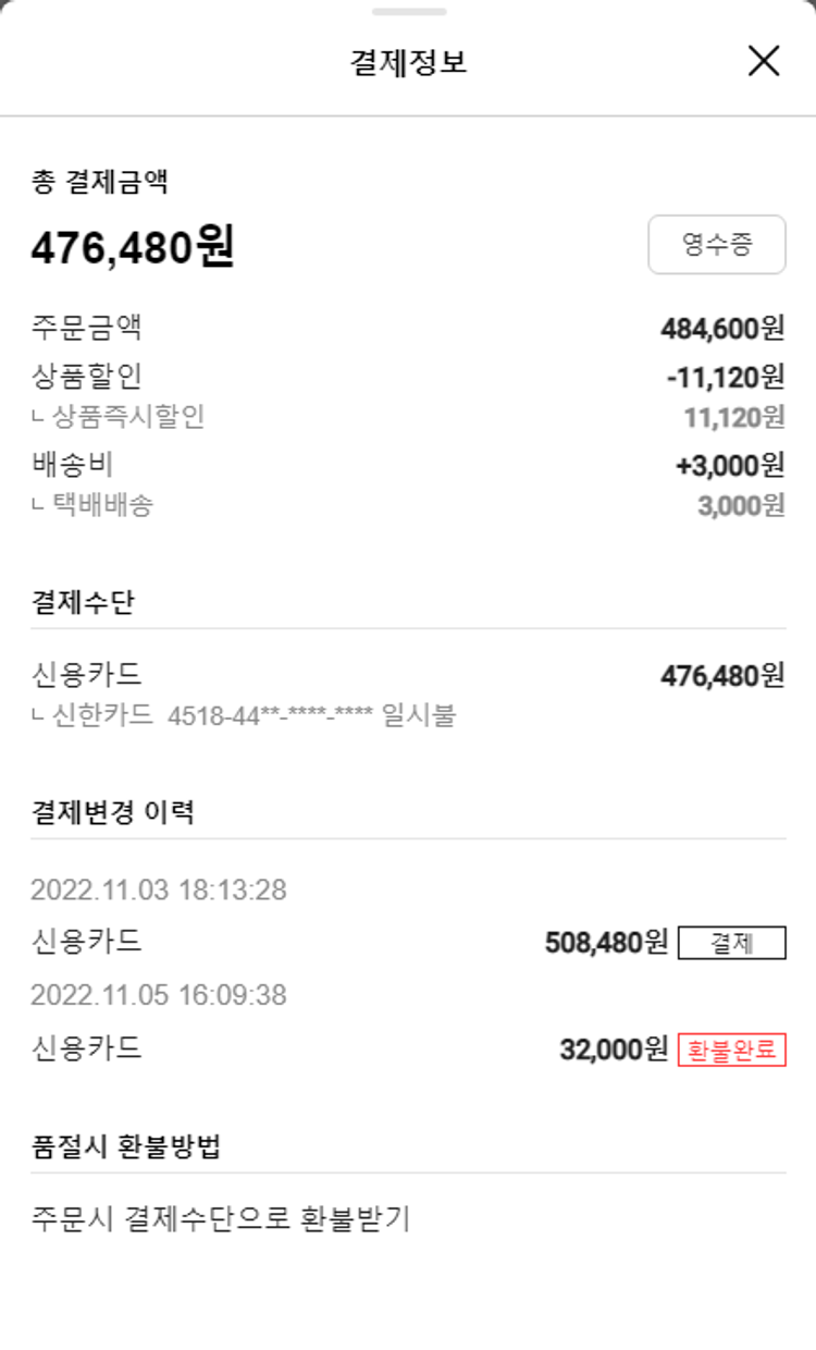 물품배송비 6,000원, 가격상승분 3,180원, 결제 수수료 9,350원, 기타 사업비는 행복나눔재단이 부담했습니다. (기부후기 발송시점에 최종 업데이트 됩니다.) 주문 이후 품절건이 발생하여 2022.11.08. 재주문하였습니다. 실제 쇼핑몰에서 확인되는 배송현황을 캡처한 내용입니다. 실시간 자료와는 차이가 있을 수 있습니다.