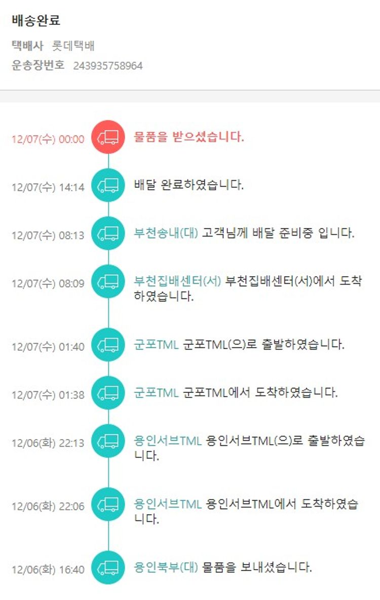 기부자님이 사용한 기부포인트 44,350원, 물품배송비 3,500원, 가격상승분 2,592원, 100원 미만 지원금 38원, 결제 수수료 11,295원, 기타 사업비는 행복나눔재단이 부담했습니다. (기부후기 발송시점에 최종 업데이트 됩니다.) 실제 쇼핑몰에서 확인되는 배송현황을 캡처한 내용입니다. 실시간 자료와는 차이가 있을 수 있습니다.