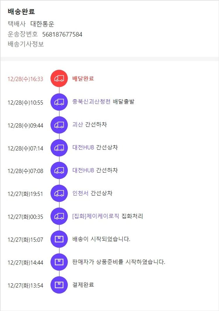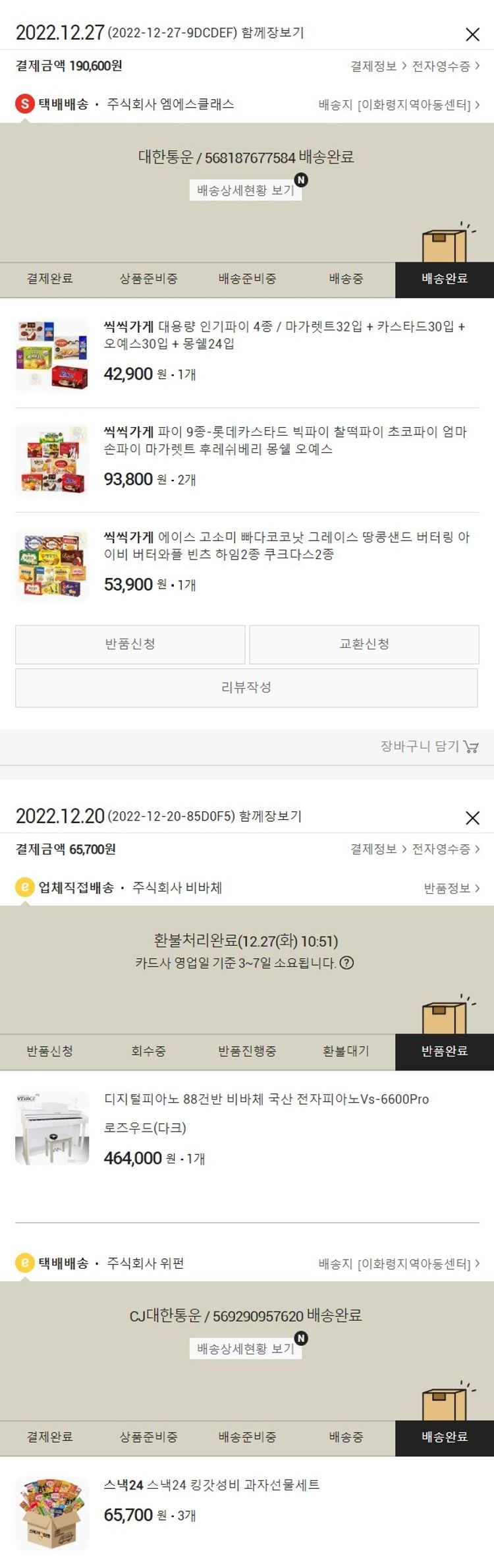기부자님이 사용한 기부포인트 17,500원, 가격상승분 5,600원, 결제 수수료 10,003원, 기타 사업비는 행복나눔재단이 부담했습니다. (기부후기 발송시점에 최종 업데이트 됩니다.) 주문완료 진행했으나 피아노 품절 및 배송 지연의 이슈로 아이들이 연말에 파티를 즐길 수 있는 간식으로 대체하여 2022.12.27. 재주문했습니다. 실제 쇼핑몰에서 확인되는 배송현황을 캡처한 내용입니다. 실시간 자료와는 차이가 있을 수 있습니다.