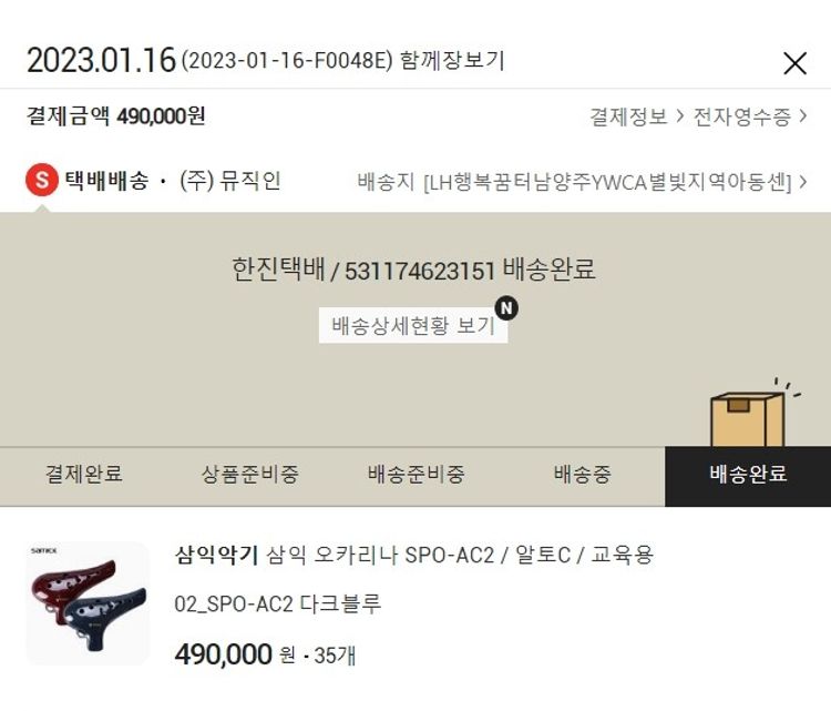 기부자님이 사용한 기부포인트 2,000원, 결제 수수료 17,178원, 기타 사업비는 행복나눔재단이 부담했습니다. (기부후기 발송시점에 최종 업데이트 됩니다.) 실제 쇼핑몰에서 확인되는 배송현황을 캡처한 내용입니다. 실시간 자료와는 차이가 있을 수 있습니다.