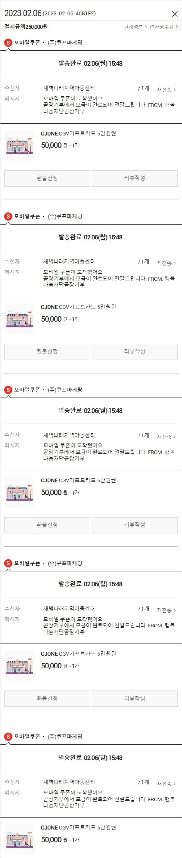 기부자님이 사용한 기부포인트 40,000원, 가격상승분 4,190원, 100원 미만 지원금 10원, 결제 수수료 14,574원, 기타 사업비는 행복나눔재단이 부담했습니다. (기부후기 발송시점에 최종 업데이트 됩니다.) 실제 쇼핑몰에서 확인되는 배송현황을 캡처한 내용입니다. 실시간 자료와는 차이가 있을 수 있습니다.