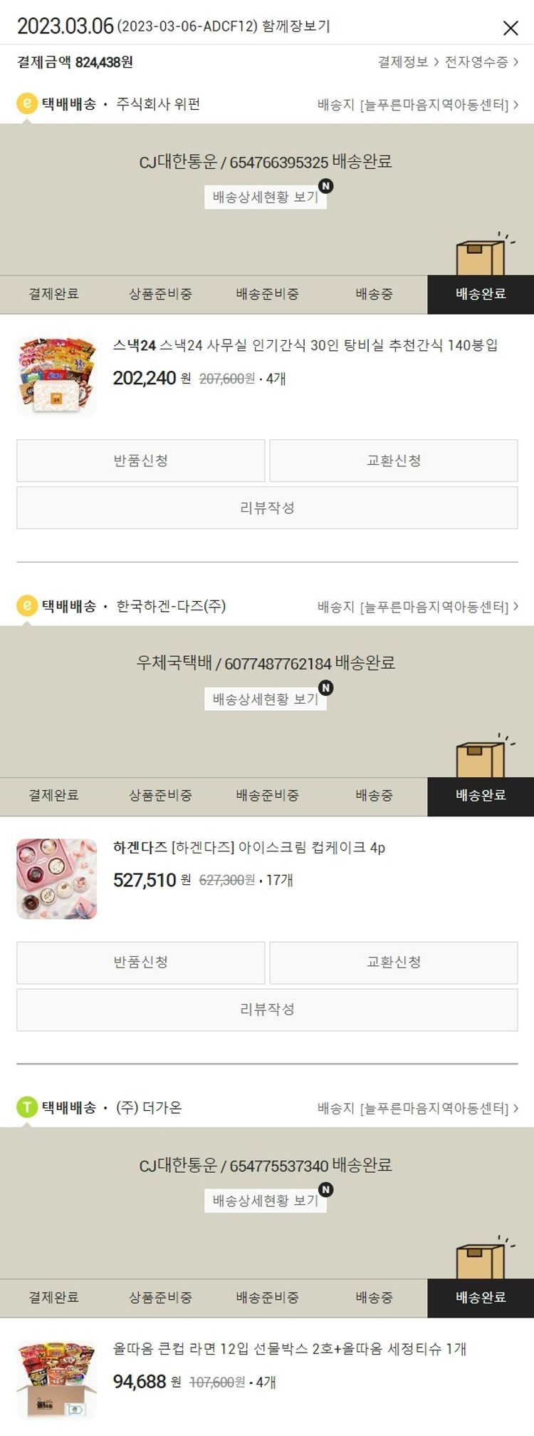 가격상승분 7,190원, 100원 미만 지원금 48원, 결제 수수료 20,092원, 기타 사업비는 행복나눔재단이 부담했습니다. (기부후기 발송시점에 최종 업데이트 됩니다.) 실제 쇼핑몰에서 확인되는 배송현황을 캡처한 내용입니다. 실시간 자료와는 차이가 있을 수 있습니다.
