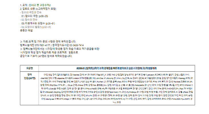 📝 신청 사연 맹학교에서 수학 교과를 지도하고 있는 시각장애를 가진 교사입니다. 매 학기 방과후 수업이나 보충수업에서 수학 심화 학습을 하고 싶은 학생들을 만나게 되는데, 그 때마다 학생을 지도하기 위한 적절한 교재를 찾기가 매우 난감합니다.