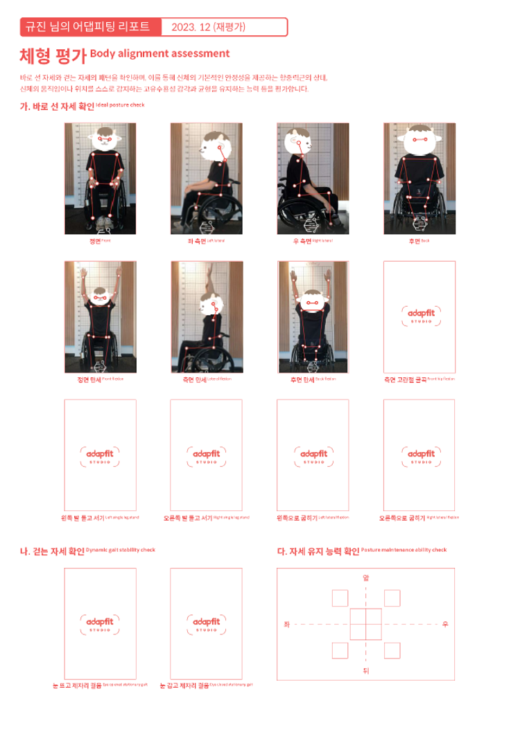2회*에 걸쳐 체형, 자세 및 신체 기능에 대한 평가를 진행합니다. 맞춤과정(명칭: 어댑피팅)의 일환으로 진행되며, 초기 평가의 결과는 종료 시점까지 변화에 대한 기준점이 됩니다. *기존 상품은 3회이나, 이전에 어댑피팅을 진행한 적이 있어 2회로 진행 후 나머지 1회는 종료 후 재평가로 진행합니다. 평가비 150,000원은 행복나눔재단이 부담합니다.