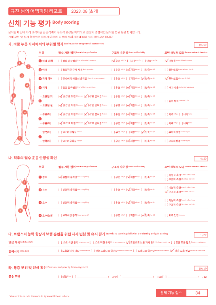 | 💪 재평가 (10월 2주 예정) 체형, 자세 및 신체 기능에 대한 재평가를 진행합니다. 초기 평가 때와 변화되는 지점을 확인합니다. |