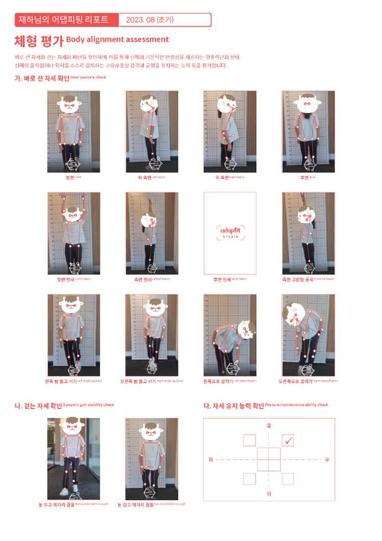 2회*에 걸쳐 체형, 자세 및 신체 기능에 대한 평가를 진행합니다. 맞춤과정(명칭: 어댑피팅)의 일환으로 진행되며, 초기 평가의 결과는 종료 시점까지 변화에 대한 기준점이 됩니다. *기존 상품은 3회이나, 이전에 어댑피팅을 진행한 적이 있어 2회로 진행 후 나머지 1회는 종료 후 재평가로 진행합니다. 평가비 150,000원은 행복나눔재단이 부담합니다.