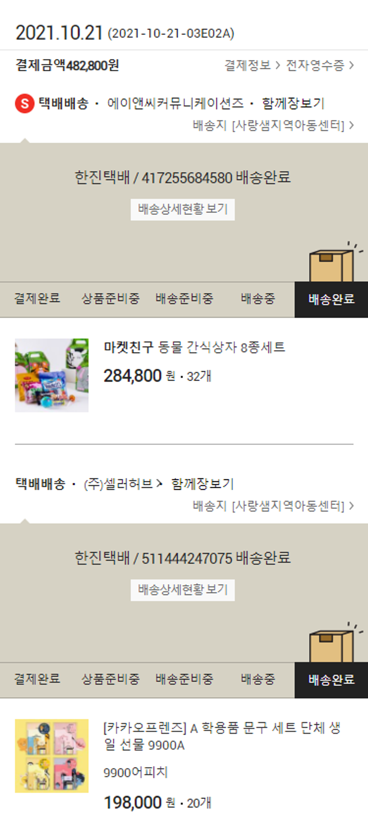 기부자님이 사용한 기부포인트 4,000원, 결제 수수료 16,400원, 기타 사업비는 행복나눔재단이 부담했습니다. (기부후기 발송시점에 최종 업데이트 됩니다.) 실제 쇼핑몰에서 확인되는 배송현황을 캡처한 내용입니다. 실시간 자료와는 차이가 있을 수 있습니다.