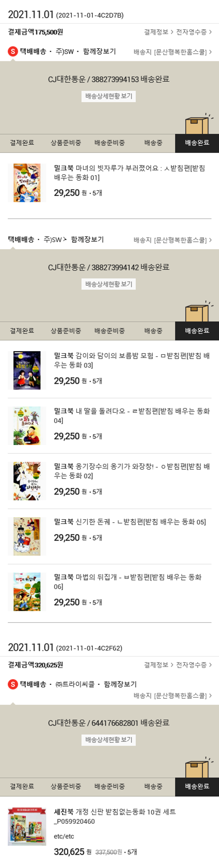 기부자님이 사용한 기부포인트 35,500원, 100원 미만 지원금 25원, 결제 수수료 15,635원, 기타 사업비는 행복나눔재단이 부담했습니다. (기부후기 발송시점에 최종 업데이트 됩니다.) 실제 쇼핑몰에서 확인되는 배송현황을 캡처한 내용입니다. 실시간 자료와는 차이가 있을 수 있습니다.