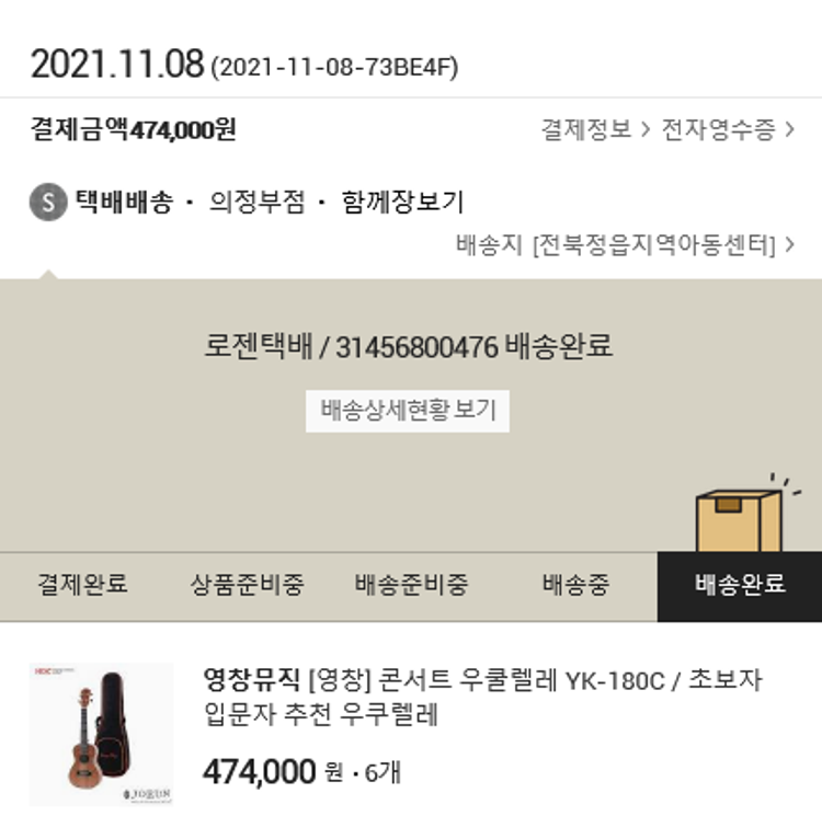 기부자님이 사용한 기부포인트 11,000원, 결제 수수료 15,263원, 기타 사업비는 행복나눔재단이 부담했습니다. (기부후기 발송시점에 최종 업데이트 됩니다.) 실제 쇼핑몰에서 확인되는 배송현황을 캡처한 내용입니다. 실시간 자료와는 차이가 있을 수 있습니다.