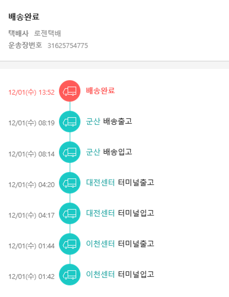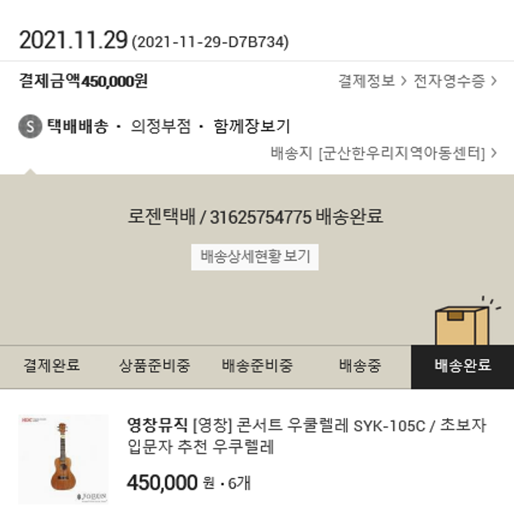 기부자님이 사용한 기부포인트 6,750원, 결제 수수료 9,928원, 기타 사업비는 행복나눔재단이 부담했습니다. (기부후기 발송시점에 최종 업데이트 됩니다.) 실제 쇼핑몰에서 확인되는 배송현황을 캡처한 내용입니다. 실시간 자료와는 차이가 있을 수 있습니다.