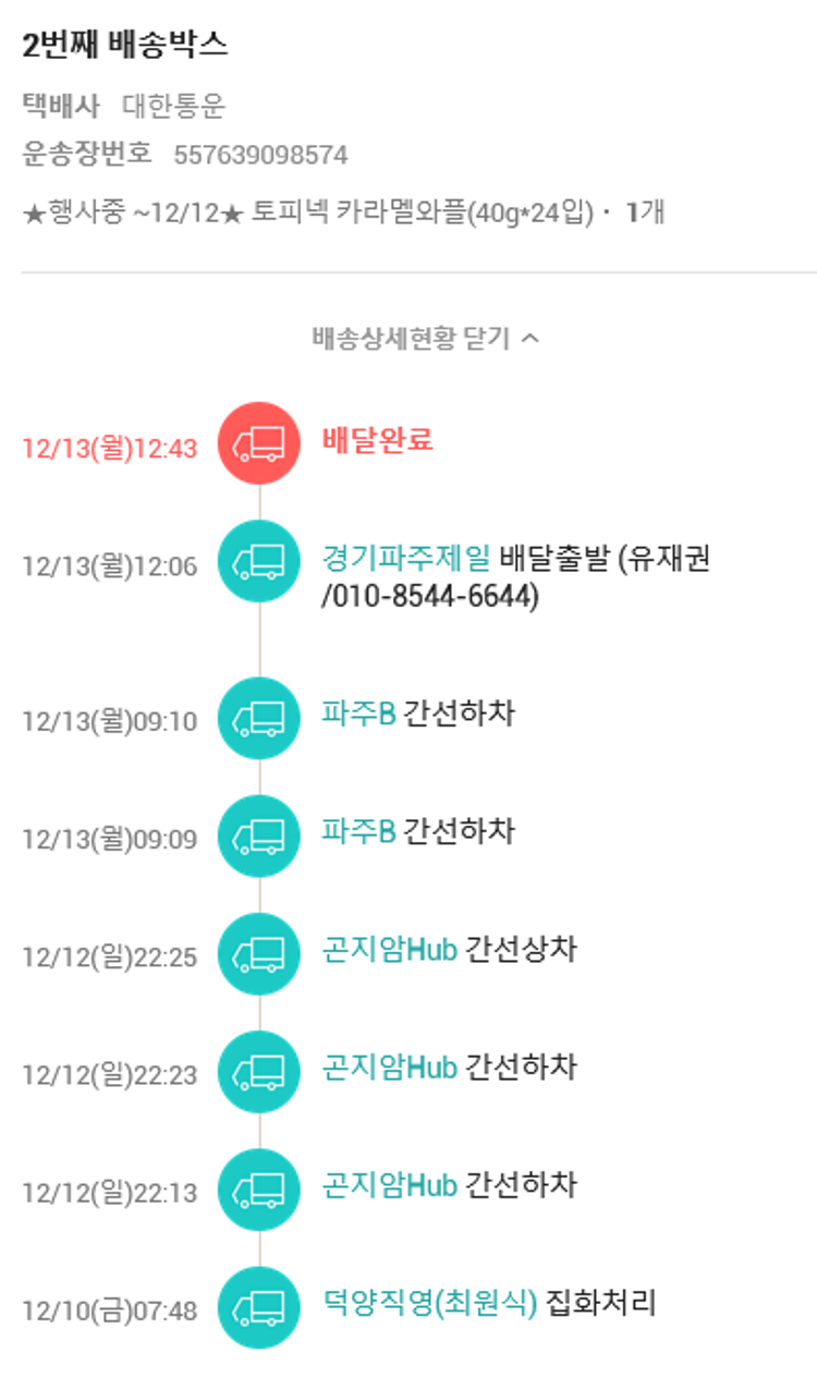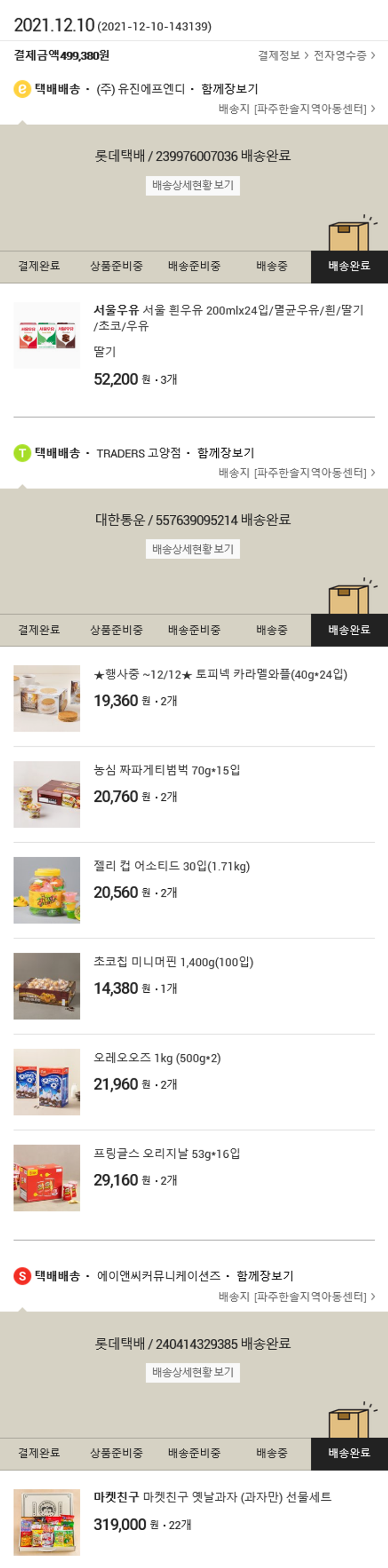 기부자님이 사용한 기부포인트 17,000원, 물품배송비 2,000원, 100원 미만 지원금 80원, 결제 수수료 16,348원, 기타 사업비는 행복나눔재단이 부담했습니다. (기부후기 발송시점에 최종 업데이트 됩니다.) 실제 쇼핑몰에서 확인되는 배송현황을 캡처한 내용입니다. 실시간 자료와는 차이가 있을 수 있습니다.