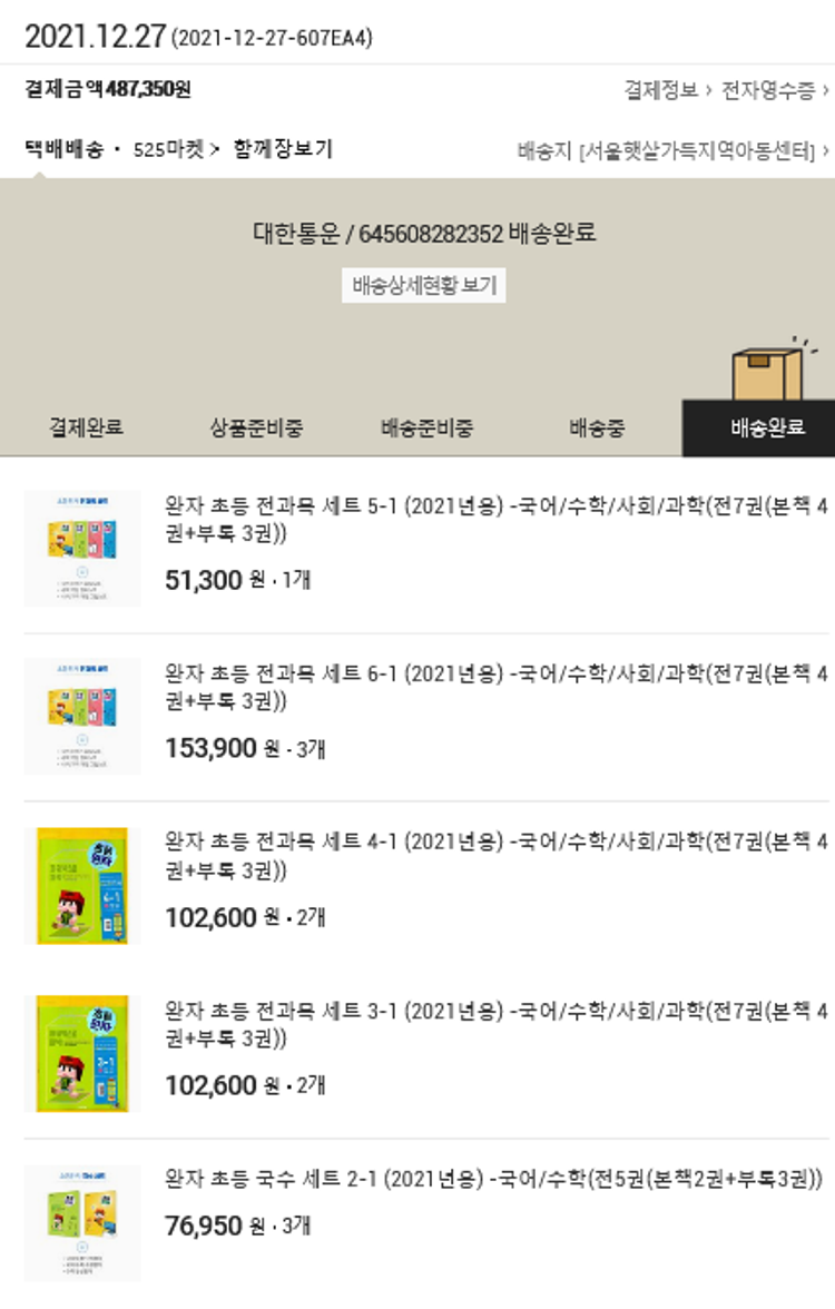 완자 초등 전과목 세트 5-1 (2021년용) -국어/수학/사회/과학(전7권(본책 4권+부록 3권))1개 (개당 51,300원)