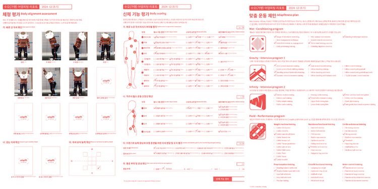 어댑핏 스튜디오의 다양한 운동 프로그램을 제공한 뒤, 회원 별로 적절한 운동을 추천드립니다. 추천된 운동은 초기 평가 결과와 함께 리포트 형태로 제공드립니다. |