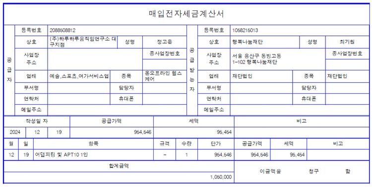추천 운동을 참고해 맞춤운동(PT)을 진행합니다. 꾸준히 운동할 수 있도록 주2회 이용권을 선택했습니다. - 4,500,000원 (주2회 10회 이용권 단가 900,000원 x 5인) |