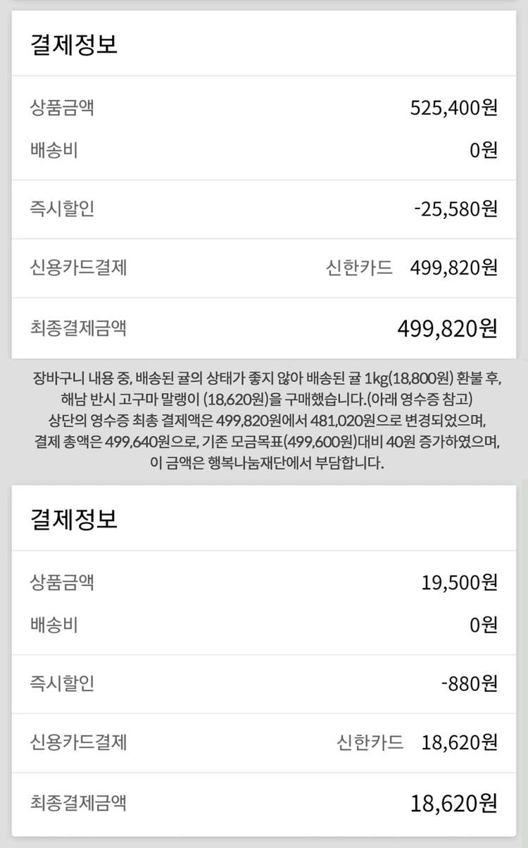 기부자님이 사용한 기부포인트 43,000원, 가격상승분 40원, 결제 수수료 11,563원, 기타 사업비는 행복나눔재단이 부담했습니다. (기부후기 발송시점에 최종 업데이트 됩니다.) 실제 쇼핑몰에서 확인되는 배송현황을 캡처한 내용입니다. 실시간 자료와는 차이가 있을 수 있습니다.