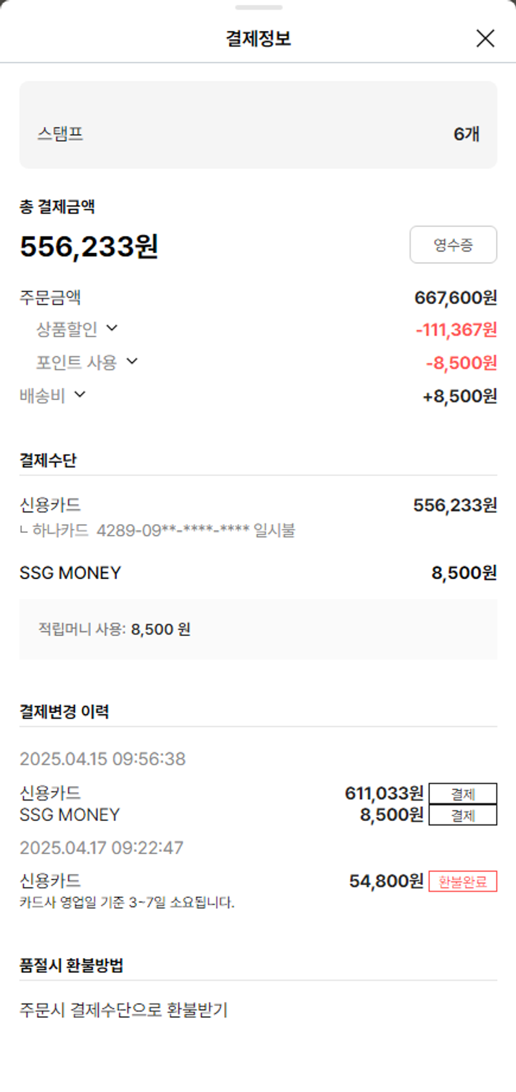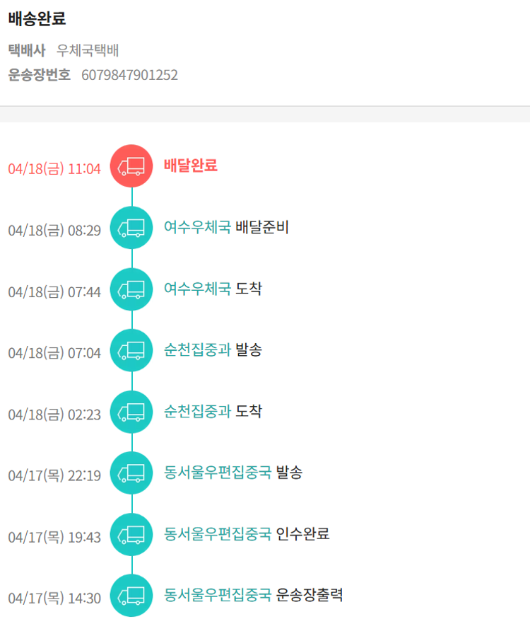 기부자님이 사용한 기부포인트 10,800원, 가격상승분 1,492원, 100원 미만 지원금 1원, SSG 머니 8,500포인트, 결제 수수료 14,271원, 기타 사업비는 행복나눔재단이 부담했습니다. (기부후기 발송시점에 최종 업데이트 됩니다.) 상품 주문 건 중 품절 발생하여 2025-04-17 재주문하였습니다. 실제 쇼핑몰에서 확인되는 배송현황을 캡처한 내용입니다. 실시간 자료와는 차이가 있을 수 있습니다.