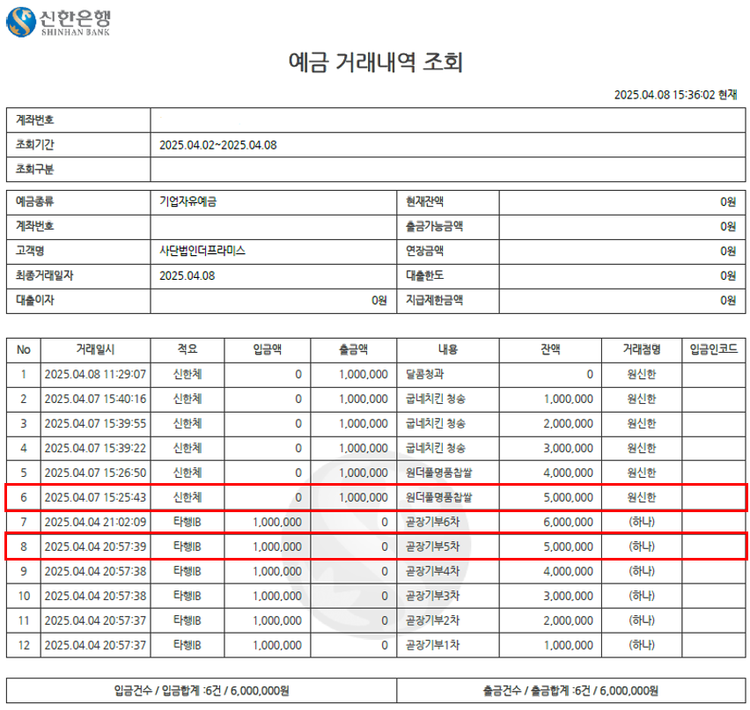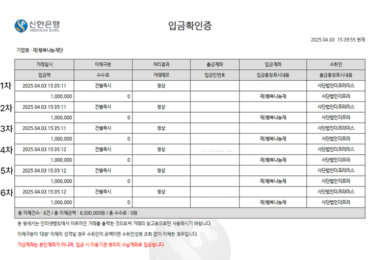 2025-04-02에 진행된 산불 피해 모금은 총 6차까지 모금 완료되어 2025-04-03에 일괄 이체되었습니다. 이체 내역은 하단의 결제정보 보기를 통해 확인 가능합니다.