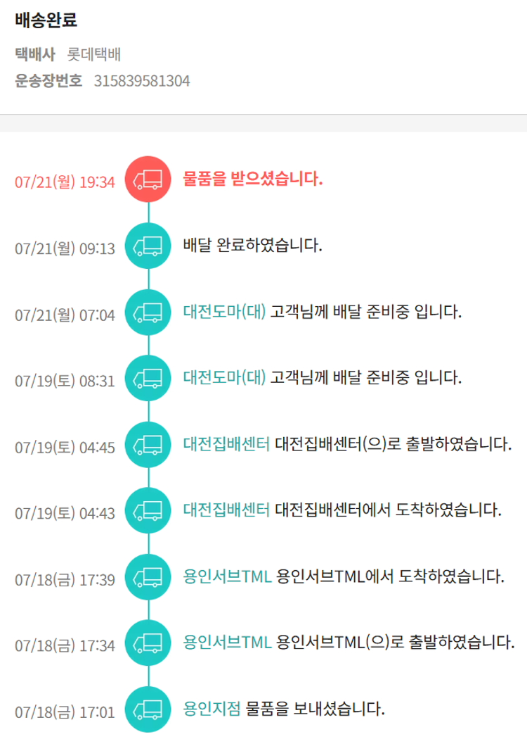 기부자님이 사용한 기부포인트 4,100원, 물품배송비 6,500원, 가격상승분 6,170원, 100원 미만 지원금 30원, 결제 수수료 10,942원, 기타 사업비는 행복나눔재단이 부담했습니다. (기부후기 발송시점에 최종 업데이트 됩니다.) 상품 주문 건 중 품절 발생하여 2025-07-17 재주문하였습니다. 실제 쇼핑몰에서 확인되는 배송현황을 캡처한 내용입니다. 실시간 자료와는 차이가 있을 수 있습니다.