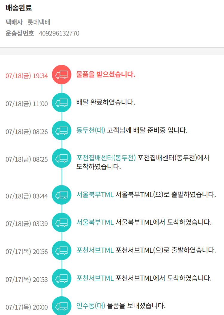 기부자님이 사용한 기부포인트 3,600원, 물품배송비 3,000원, 가격상승분 6,190원, 결제 수수료 11,567원, 기타 사업비는 행복나눔재단이 부담했습니다. (기부후기 발송시점에 최종 업데이트 됩니다.) 상품 주문 건 중 품절 발생하여 2025-07-17 재주문하였습니다. 실제 쇼핑몰에서 확인되는 배송현황을 캡처한 내용입니다. 실시간 자료와는 차이가 있을 수 있습니다.