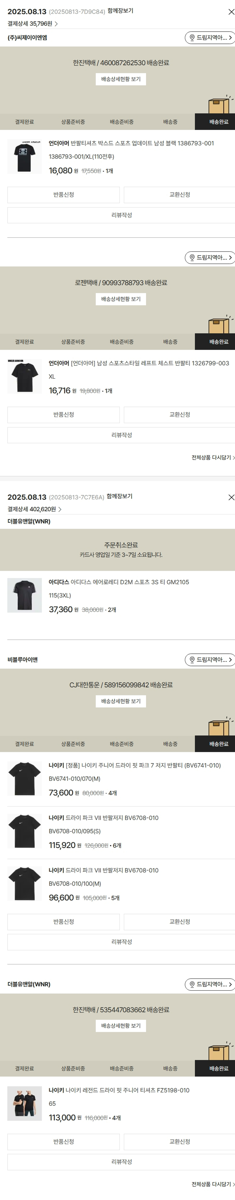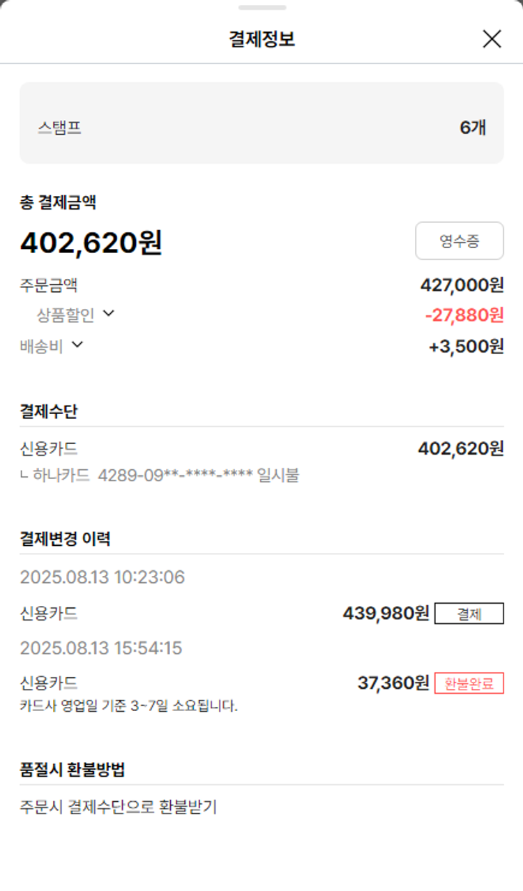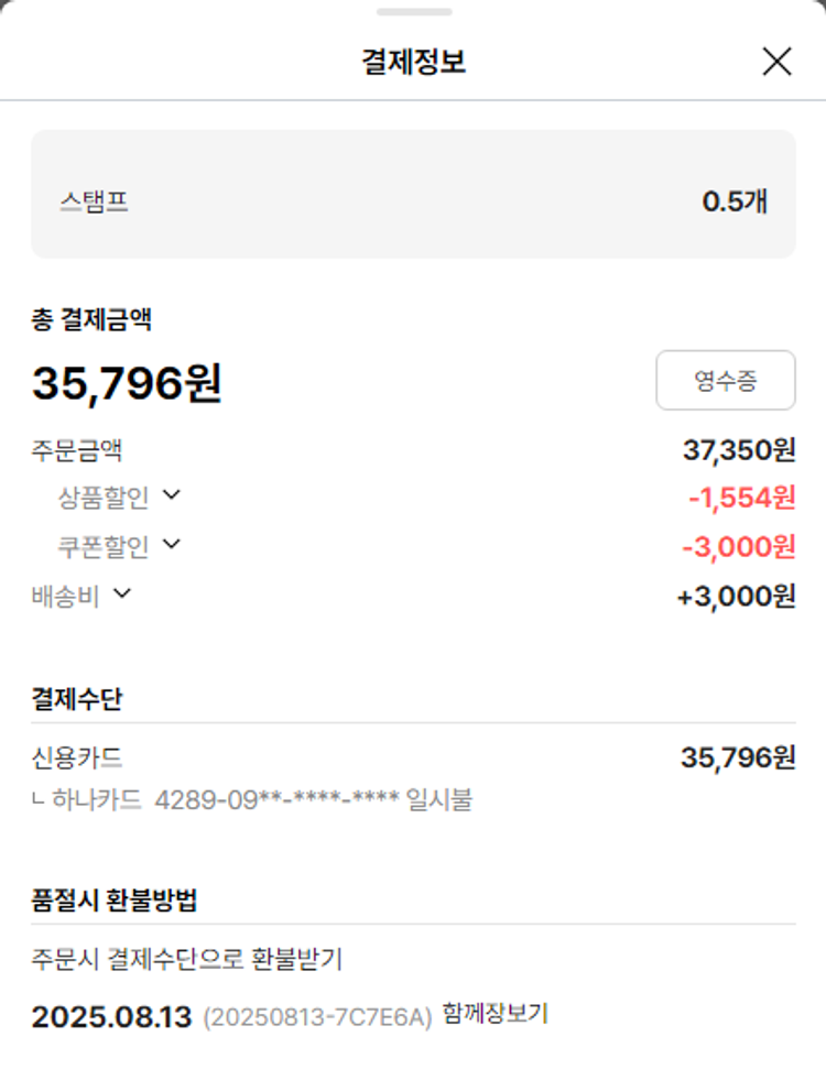 기부자님이 사용한 기부포인트 5,100원, 물품배송비 6,500원, 가격상승분 7,436원, 100원 미만 지원금 80원, 결제 수수료 9,801원, 기타 사업비는 행복나눔재단이 부담했습니다. (기부후기 발송시점에 최종 업데이트 됩니다.) 상품 주문 건 중 품절 발생하여 2025-08-13 재주문하였습니다. 실제 쇼핑몰에서 확인되는 배송현황을 캡처한 내용입니다. 실시간 자료와는 차이가 있을 수 있습니다.