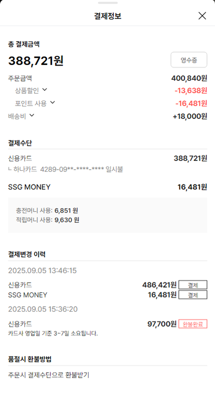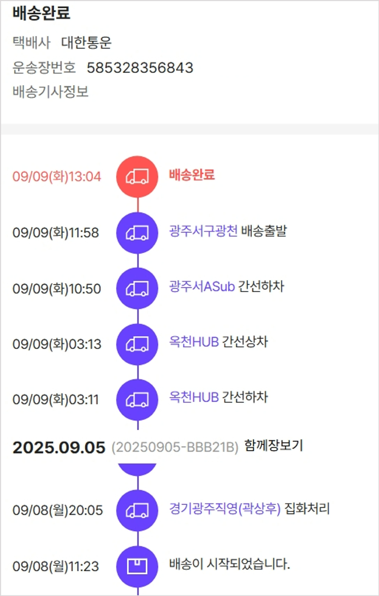 기부자님이 사용한 기부포인트 5,200원, 물품배송비 1,519원, 가격상승분 24,022원, 100원 미만 지원금 80원, SSG 머니 16,481포인트, 결제 수수료 11,537원, 기타 사업비는 행복나눔재단이 부담했습니다. (기부후기 발송시점에 최종 업데이트 됩니다.) 상품 주문 건 중 품절 발생하여 2025-09-08 재주문하였습니다. 실제 쇼핑몰에서 확인되는 배송현황을 캡처한 내용입니다. 실시간 자료와는 차이가 있을 수 있습니다.