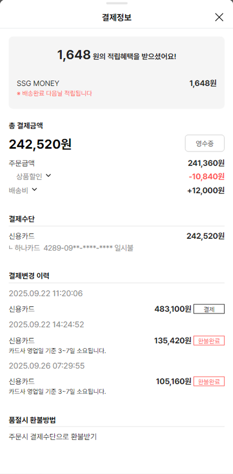 기부자님이 사용한 기부포인트 1,600원, 물품배송비 12,000원, 가격상승분 8,710원, 100원 미만 지원금 80원, 결제 수수료 11,108원, 기타 사업비는 행복나눔재단이 부담했습니다. (기부후기 발송시점에 최종 업데이트 됩니다.) 상품 주문 건 중 품절 발생하여 2025-10-17 재주문하였습니다. 실제 쇼핑몰에서 확인되는 배송현황을 캡처한 내용입니다. 실시간 자료와는 차이가 있을 수 있습니다.