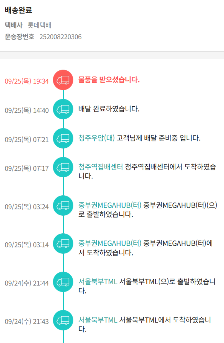 기부자님이 사용한 기부포인트 17,900원, 물품배송비 12,000원, 가격상승분 6,096원, 100원 미만 지원금 50원, 결제 수수료 10,880원, 기타 사업비는 행복나눔재단이 부담했습니다. (기부후기 발송시점에 최종 업데이트 됩니다.) 상품 주문 건 중 품절 발생하여 2025-09-24 재주문하였습니다. 실제 쇼핑몰에서 확인되는 배송현황을 캡처한 내용입니다. 실시간 자료와는 차이가 있을 수 있습니다.