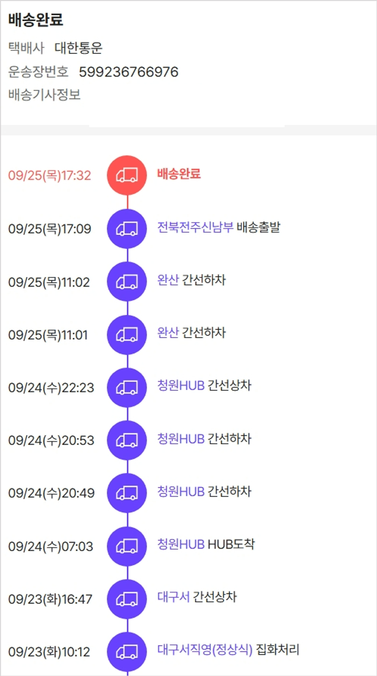 기부자님이 사용한 기부포인트 6,900원, 물품배송비 14,000원, 가격상승분 1,170원, 결제 수수료 10,548원, 기타 사업비는 행복나눔재단이 부담했습니다. (기부후기 발송시점에 최종 업데이트 됩니다.) 실제 쇼핑몰에서 확인되는 배송현황을 캡처한 내용입니다. 실시간 자료와는 차이가 있을 수 있습니다.