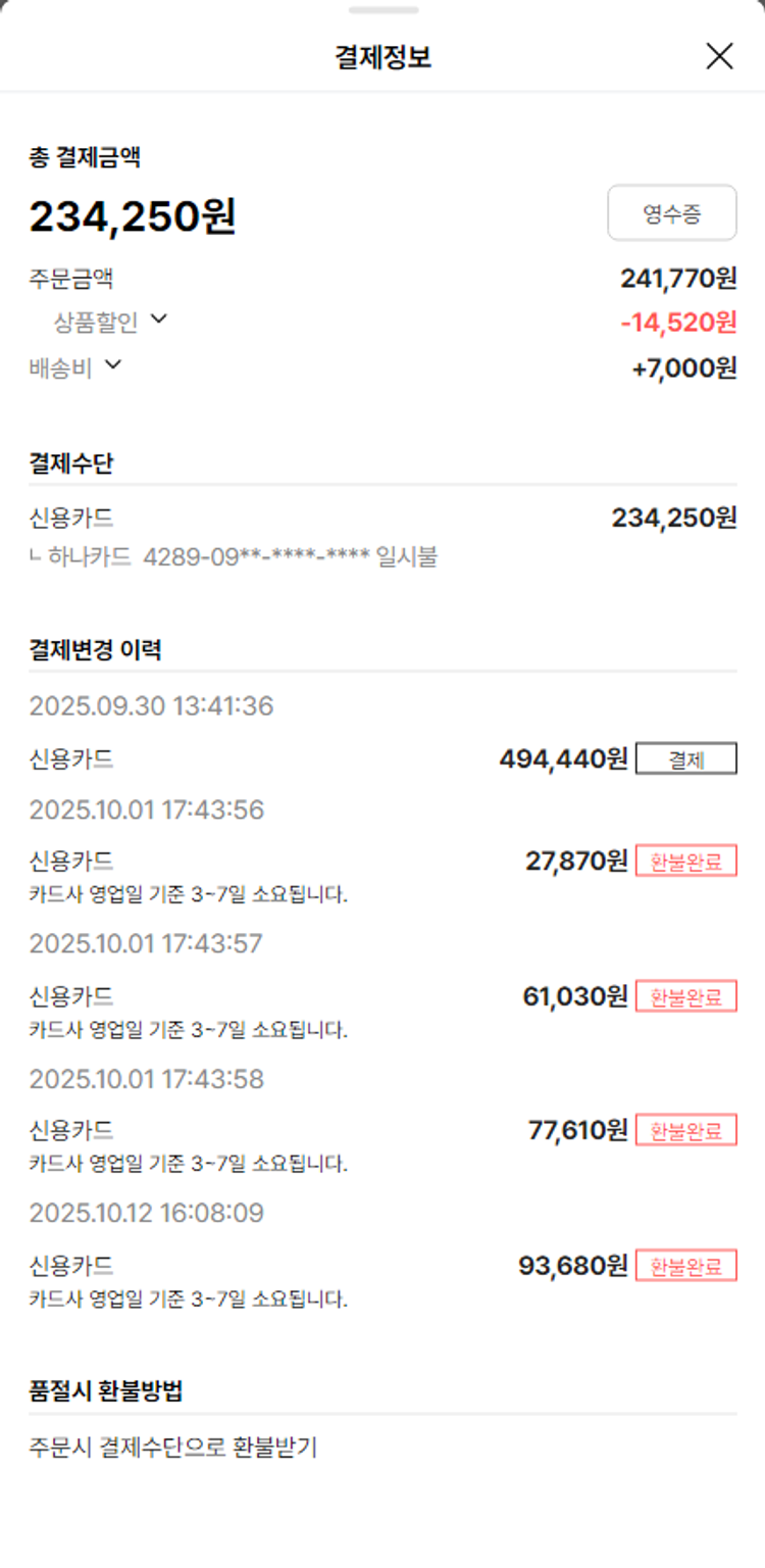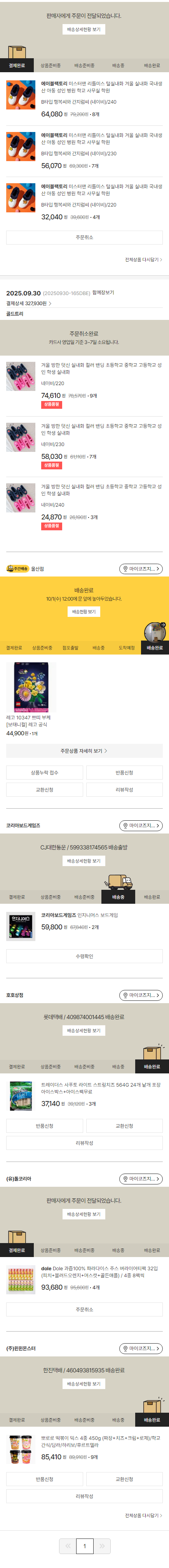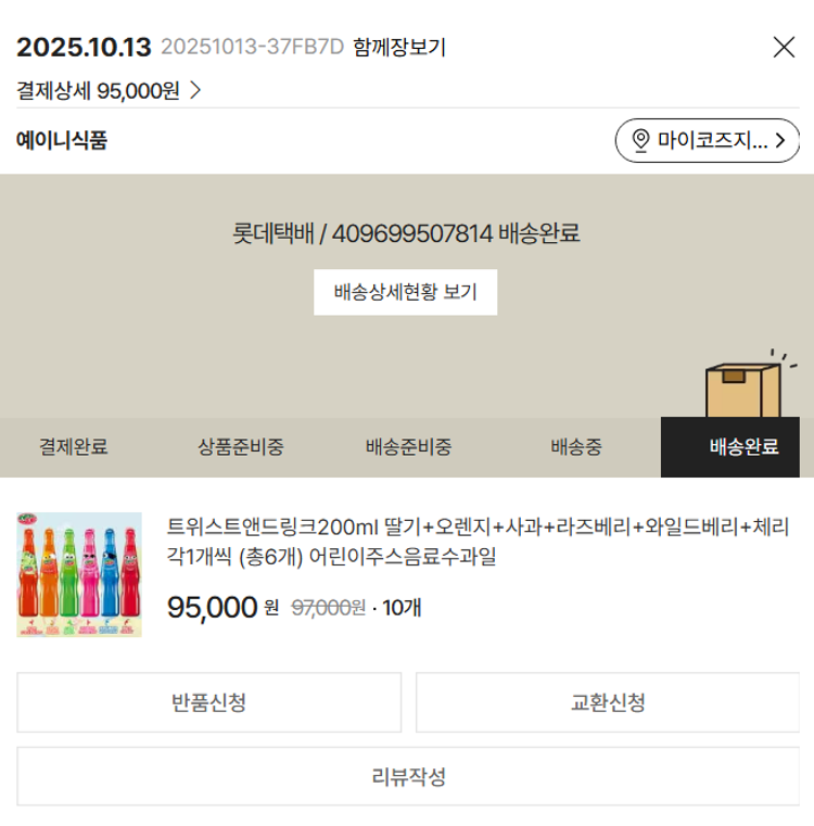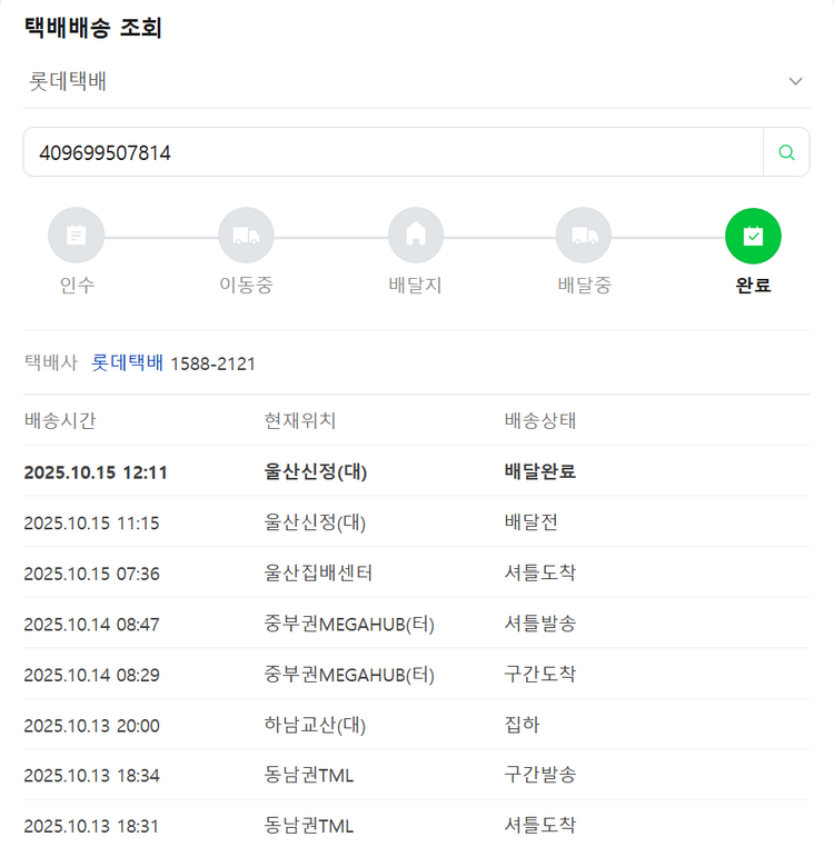 기부자님이 사용한 기부포인트 15,000원, 물품배송비 7,000원, 가격상승분 7,210원, 결제 수수료 11,757원, 기타 사업비는 행복나눔재단이 부담했습니다. (기부후기 발송시점에 최종 업데이트 됩니다.) 상품 주문 건 중 품절 발생하여 2025-10-13 재주문하였습니다. 실제 쇼핑몰에서 확인되는 배송현황을 캡처한 내용입니다. 실시간 자료와는 차이가 있을 수 있습니다.
