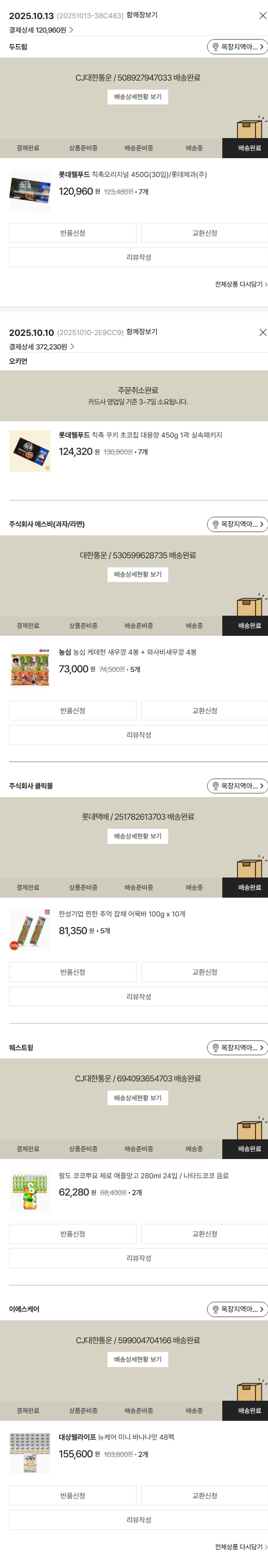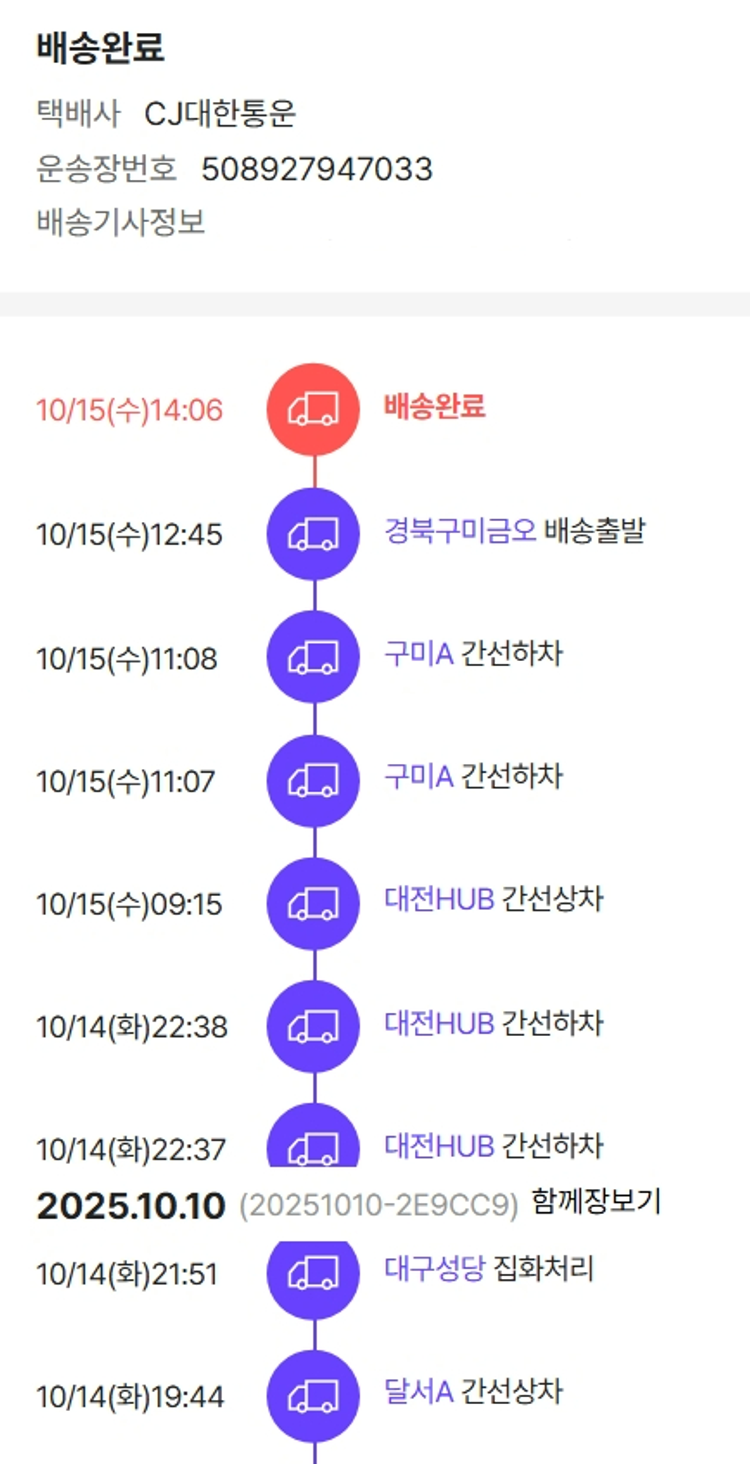 기부자님이 사용한 기부포인트 2,100원, 가격상승분 9,520원, 100원 미만 지원금 70원, 결제 수수료 11,920원, 기타 사업비는 행복나눔재단이 부담했습니다. (기부후기 발송시점에 최종 업데이트 됩니다.) 상품 주문 건 중 품절 발생하여 2025-10-13 재주문하였습니다. 실제 쇼핑몰에서 확인되는 배송현황을 캡처한 내용입니다. 실시간 자료와는 차이가 있을 수 있습니다.