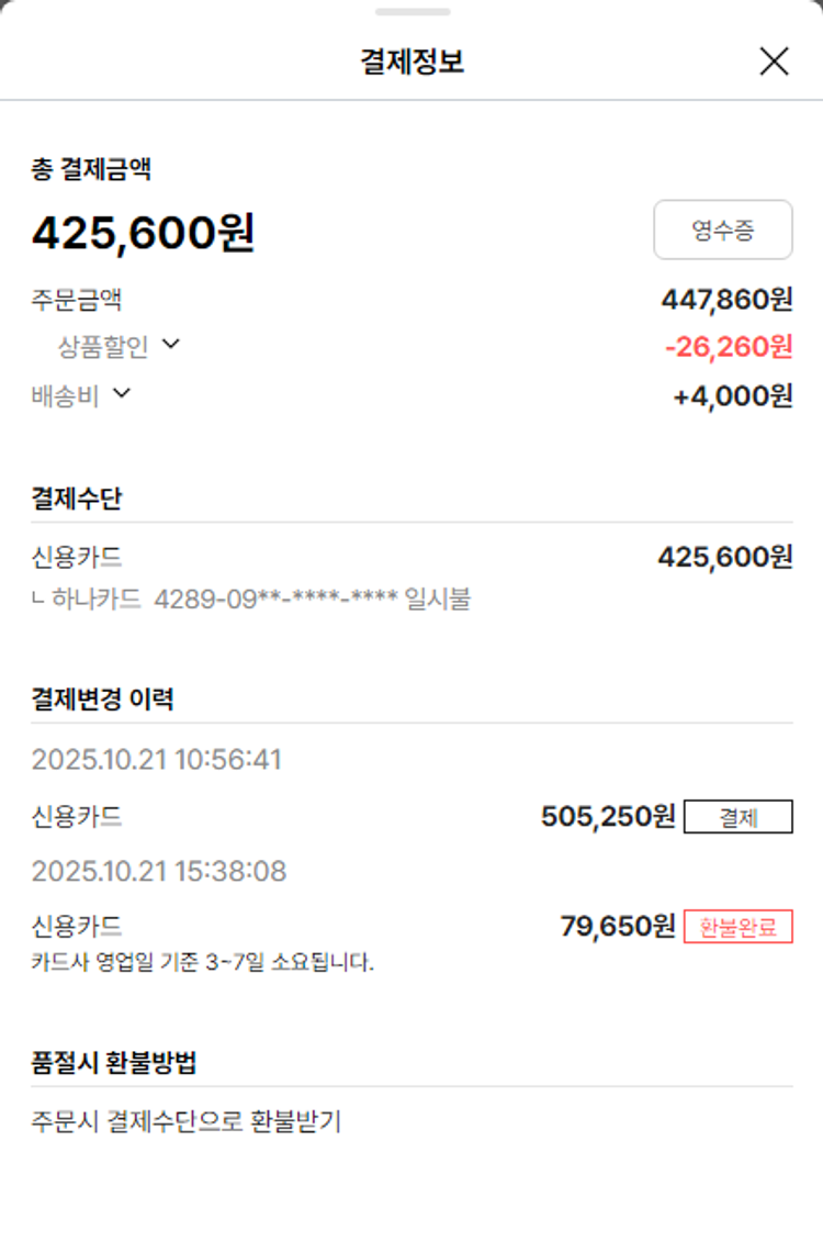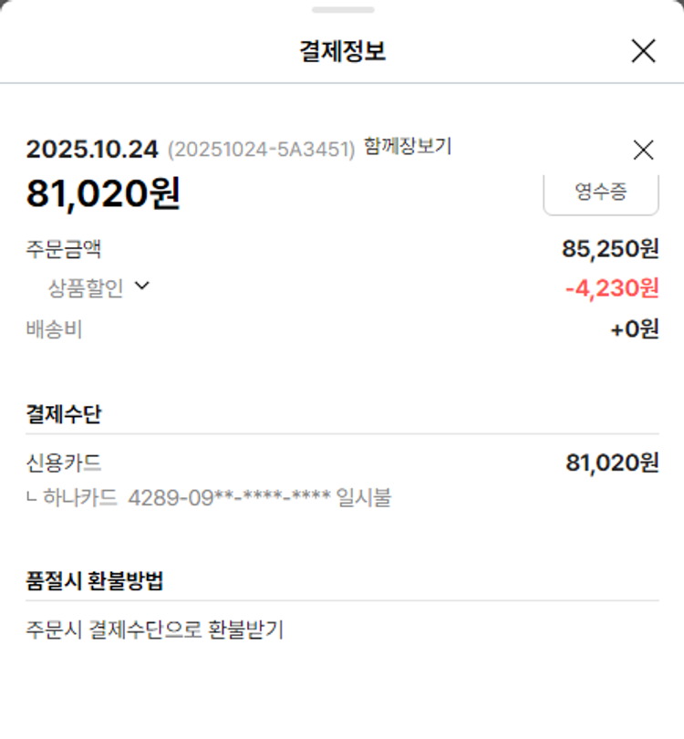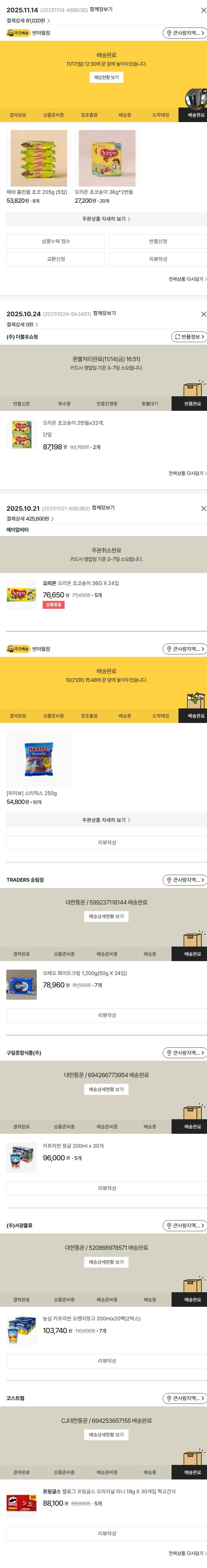 물품배송비 4,000원, 가격상승분 5,760원, 100원 미만 지원금 60원, 기타 사업비는 행복나눔재단이 부담했습니다. (기부후기 발송시점에 최종 업데이트 됩니다.) 상품 주문 건 중 품절 발생하여 2025-11-14 재주문하였습니다. 실제 쇼핑몰에서 확인되는 배송현황을 캡처한 내용입니다. 실시간 자료와는 차이가 있을 수 있습니다.