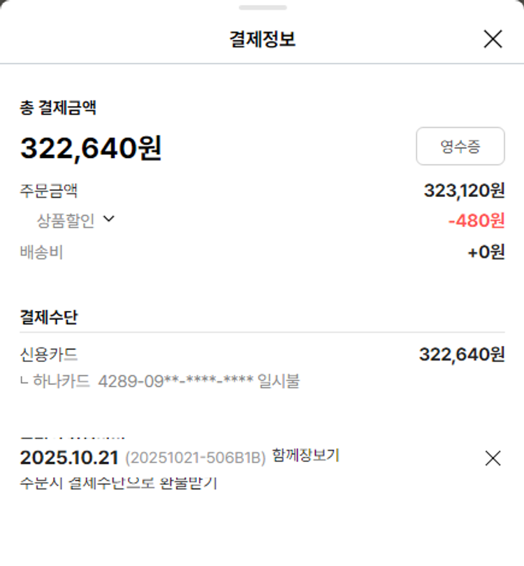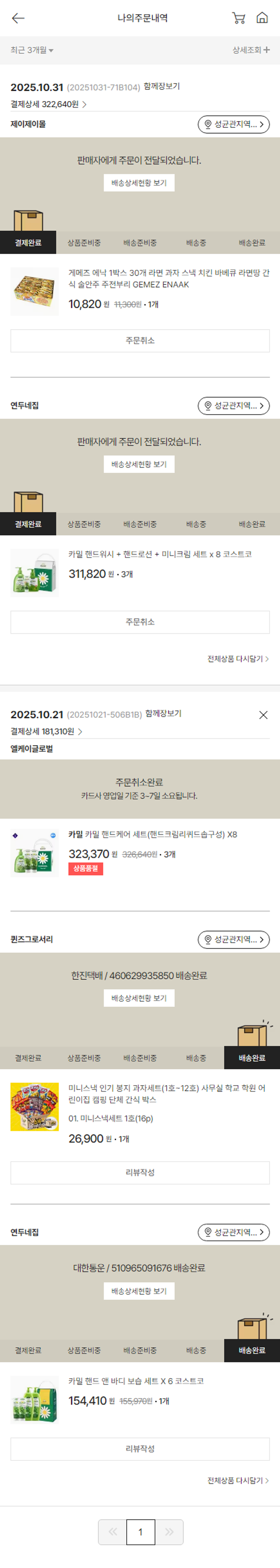 가격상승분 4,100원, 100원 미만 지원금 50원, 기타 사업비는 행복나눔재단이 부담했습니다. (기부후기 발송시점에 최종 업데이트 됩니다.) 상품 주문 건 중 품절 발생하여 2025-10-31 재주문하였습니다. 실제 쇼핑몰에서 확인되는 배송현황을 캡처한 내용입니다. 실시간 자료와는 차이가 있을 수 있습니다.