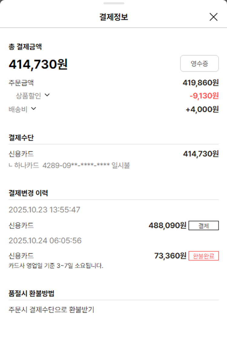 물품배송비 4,000원, 가격상승분 2,100원, 100원 미만 지원금 30원, 기타 사업비는 행복나눔재단이 부담했습니다. (기부후기 발송시점에 최종 업데이트 됩니다.) 상품 주문 건 중 품절 발생하여 2025-10-30 재주문하였습니다. 실제 쇼핑몰에서 확인되는 배송현황을 캡처한 내용입니다. 실시간 자료와는 차이가 있을 수 있습니다.