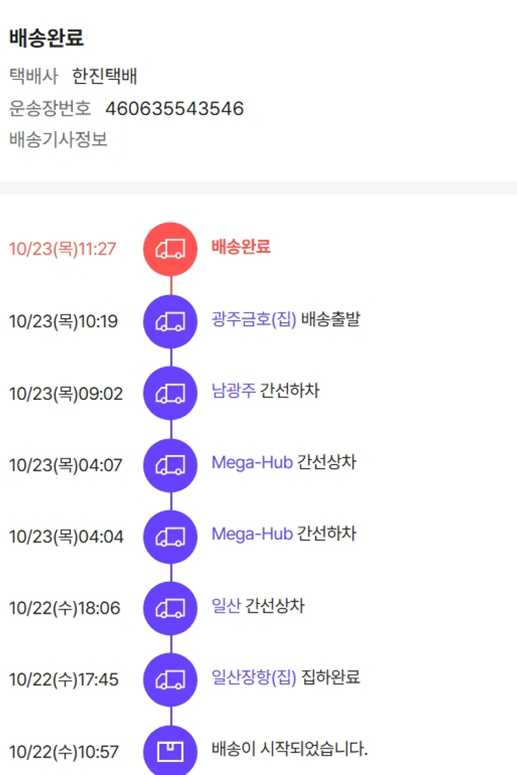 기부자님이 사용한 기부포인트 10,300원, 가격상승분 18,490원, 100원 미만 지원금 70원, 결제 수수료 10,712원, 기타 사업비는 행복나눔재단이 부담했습니다. (기부후기 발송시점에 최종 업데이트 됩니다.) 실제 쇼핑몰에서 확인되는 배송현황을 캡처한 내용입니다. 실시간 자료와는 차이가 있을 수 있습니다.