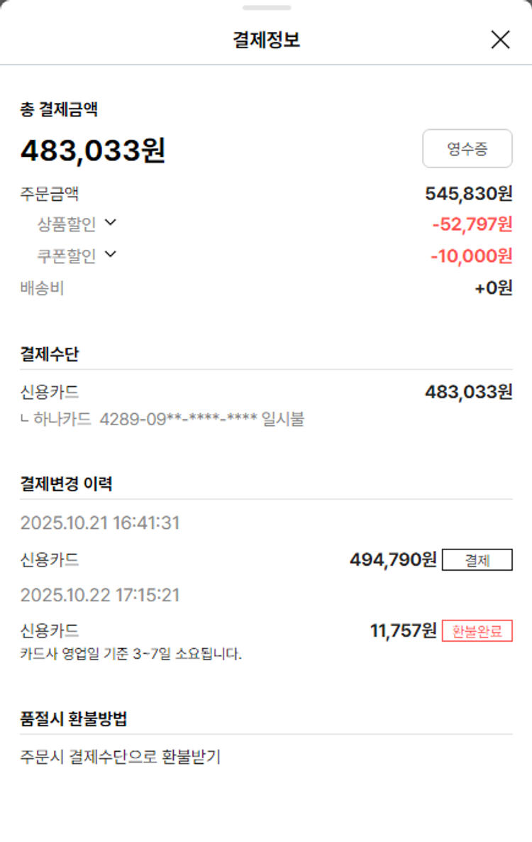 물품배송비 3,000원, 가격상승분 63원, 100원 미만 지원금 90원, 기타 사업비는 행복나눔재단이 부담했습니다. (기부후기 발송시점에 최종 업데이트 됩니다.) 상품 주문 건 중 품절 발생하여 2025-10-23 재주문하였습니다. 실제 쇼핑몰에서 확인되는 배송현황을 캡처한 내용입니다. 실시간 자료와는 차이가 있을 수 있습니다.