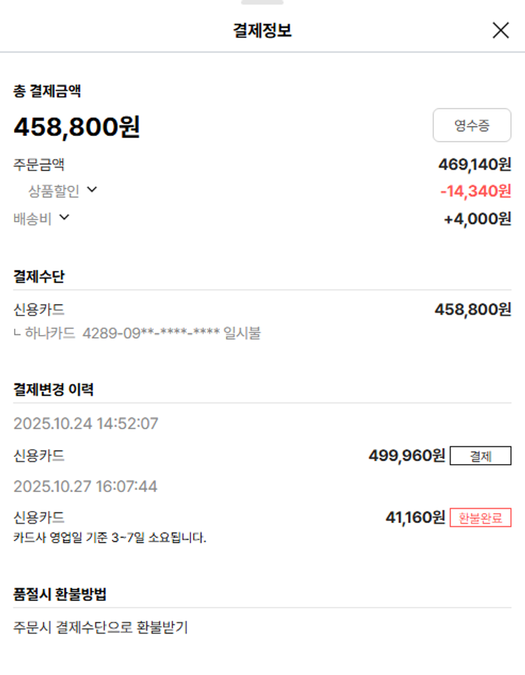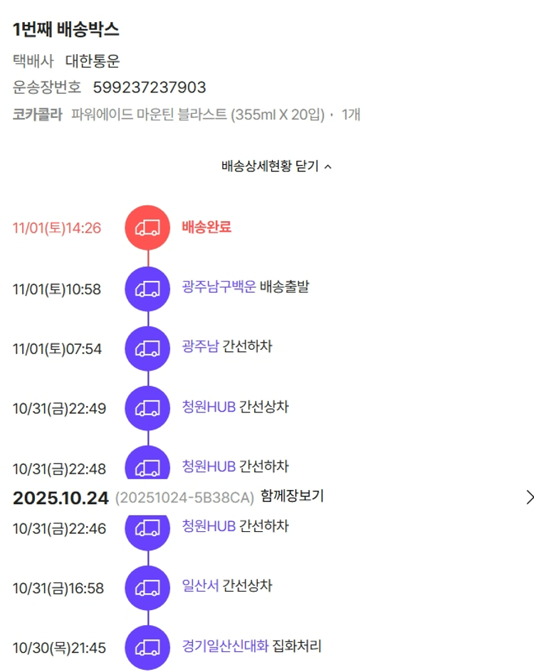 물품배송비 8,000원, 가격상승분 14,431원, 100원 미만 지원금 9원, 기타 사업비는 행복나눔재단이 부담했습니다. (기부후기 발송시점에 최종 업데이트 됩니다.) 상품 주문 건 중 품절 발생하여 2025-10-29 재주문하였습니다. 실제 쇼핑몰에서 확인되는 배송현황을 캡처한 내용입니다. 실시간 자료와는 차이가 있을 수 있습니다.