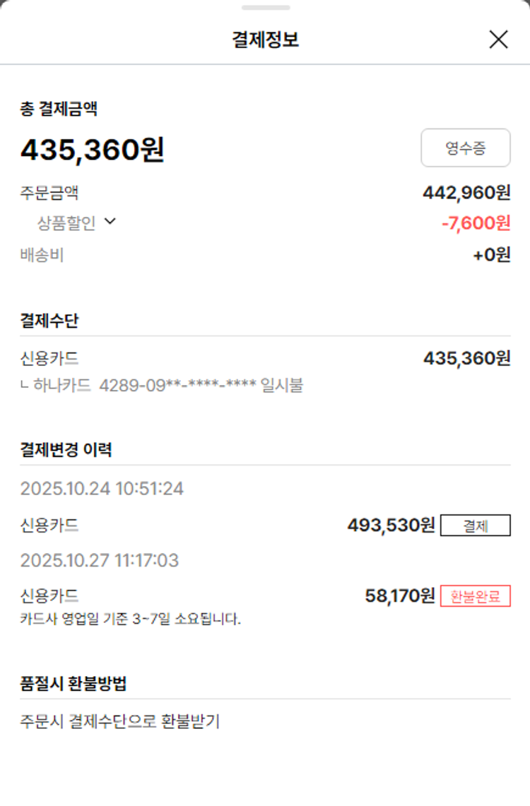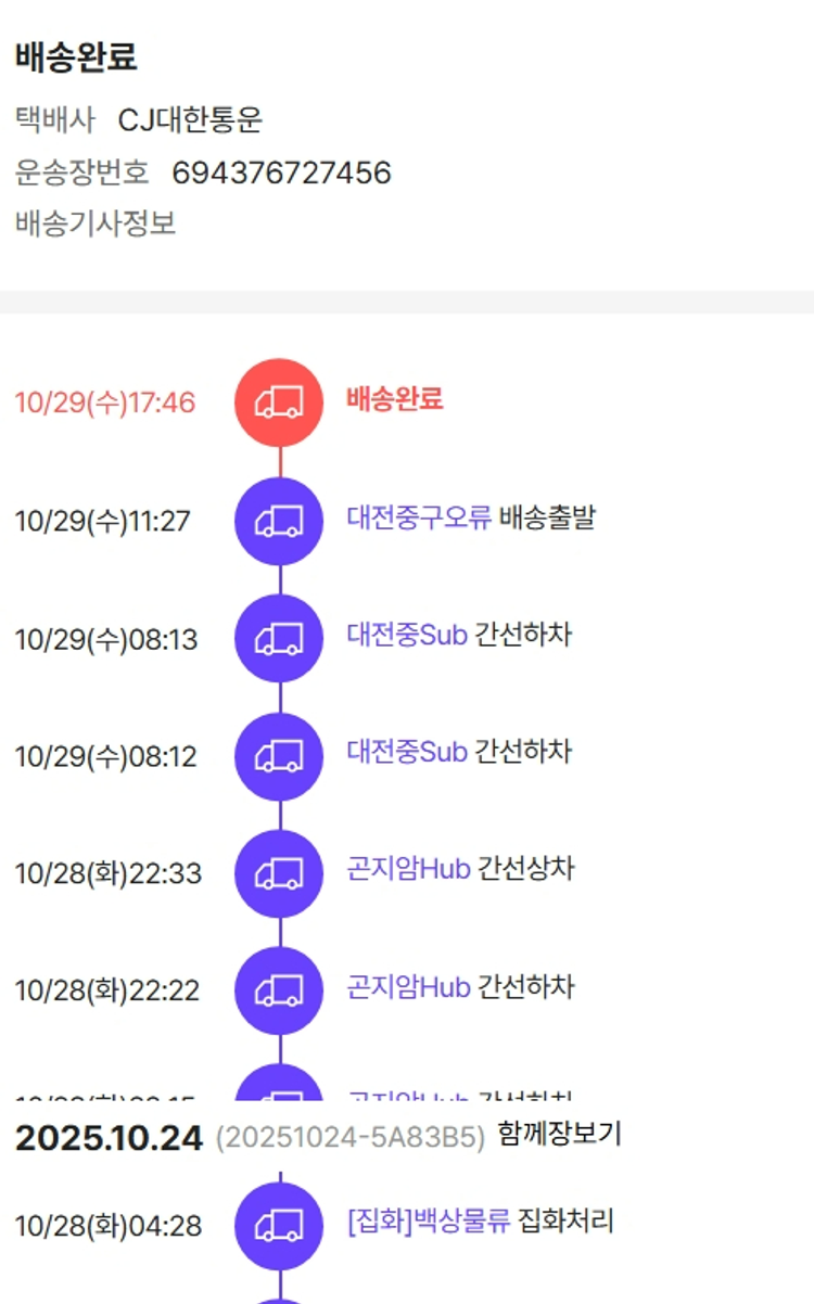 물품배송비 3,000원, 가격상승분 1,830원, 100원 미만 지원금 30원, 기타 사업비는 행복나눔재단이 부담했습니다. (기부후기 발송시점에 최종 업데이트 됩니다.) 상품 주문 건 중 품절 발생하여 2025-10-27 재주문하였습니다. 실제 쇼핑몰에서 확인되는 배송현황을 캡처한 내용입니다. 실시간 자료와는 차이가 있을 수 있습니다.