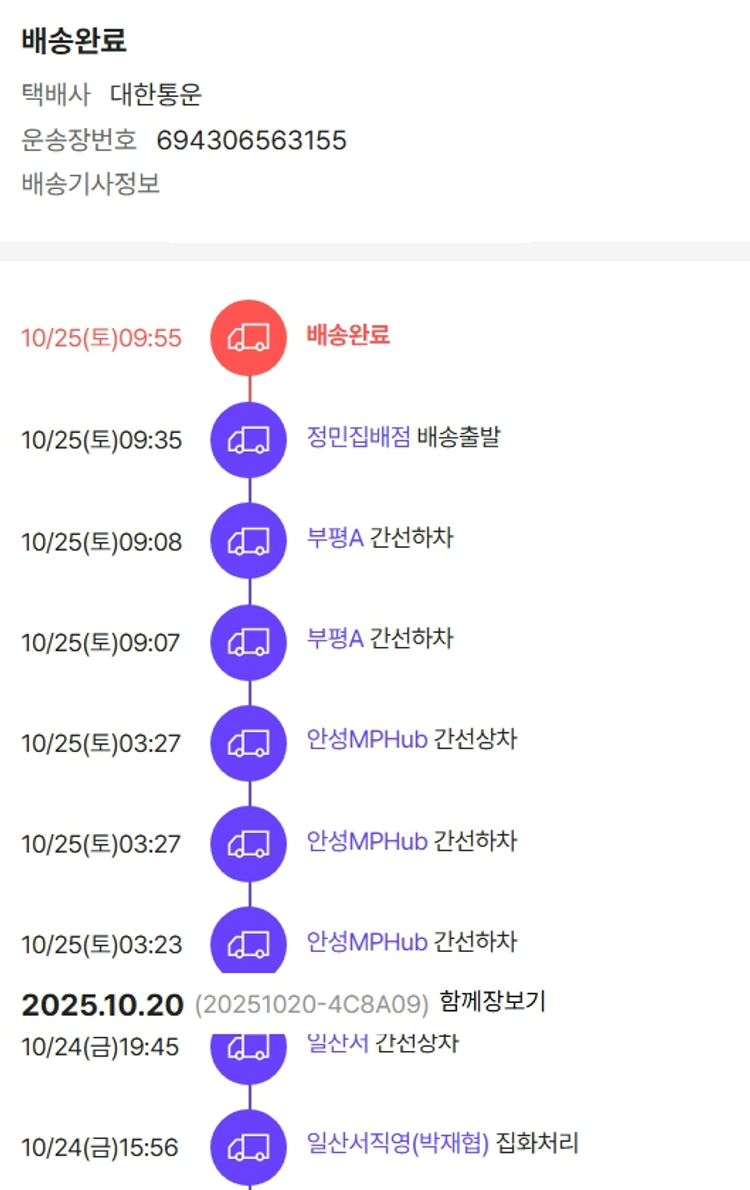 기부자님이 사용한 기부포인트 22,500원, 물품배송비 9,500원, 가격상승분 860원, 100원 미만 지원금 20원, 결제 수수료 9,644원, 기타 사업비는 행복나눔재단이 부담했습니다. (기부후기 발송시점에 최종 업데이트 됩니다.) 상품 주문 건 중 품절 발생하여 2025-10-23 재주문하였습니다. 실제 쇼핑몰에서 확인되는 배송현황을 캡처한 내용입니다. 실시간 자료와는 차이가 있을 수 있습니다.