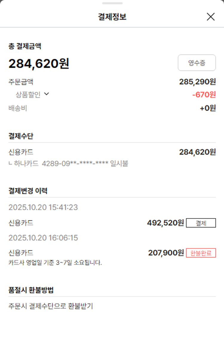 기부자님이 사용한 기부포인트 9,100원, 가격상승분 4,330원, 100원 미만 지원금 90원, 결제 수수료 10,846원, 기타 사업비는 행복나눔재단이 부담했습니다. (기부후기 발송시점에 최종 업데이트 됩니다.) 상품 주문 건 중 품절 발생하여 2025-10-21 재주문하였습니다. 실제 쇼핑몰에서 확인되는 배송현황을 캡처한 내용입니다. 실시간 자료와는 차이가 있을 수 있습니다.