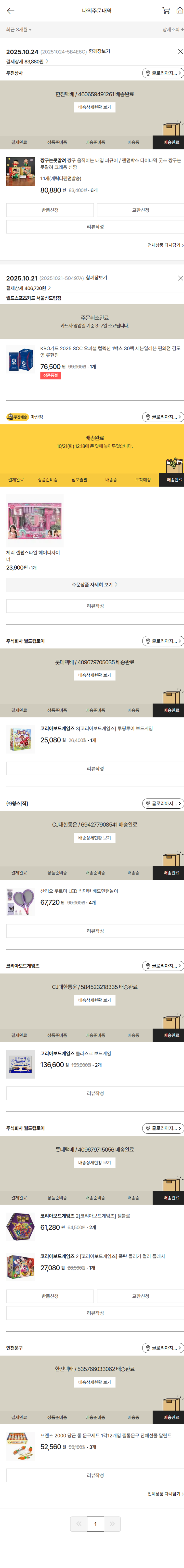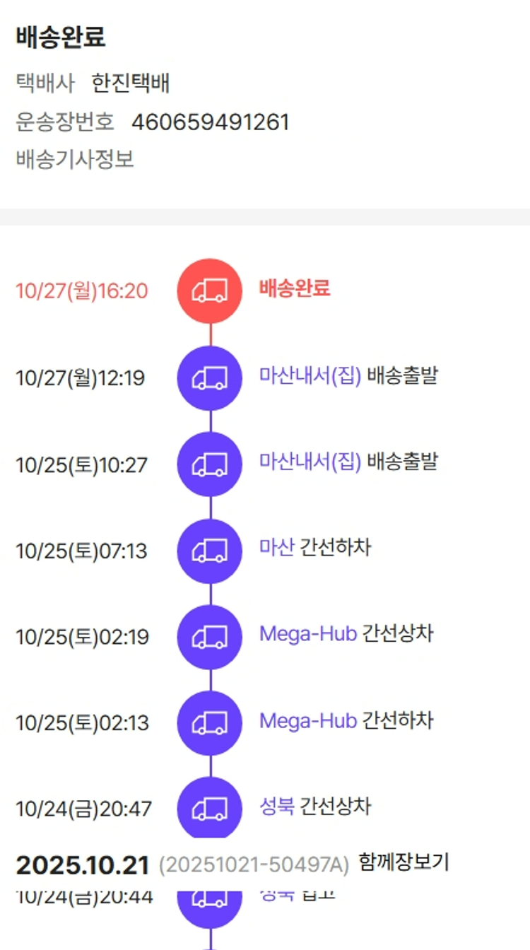 기부자님이 사용한 기부포인트 1,000원, 물품배송비 15,500원, 가격상승분 5,430원, 100원 미만 지원금 70원, 결제 수수료 10,344원, 기타 사업비는 행복나눔재단이 부담했습니다. (기부후기 발송시점에 최종 업데이트 됩니다.) 상품 주문 건 중 품절 발생하여 2025-10-24 재주문하였습니다. 실제 쇼핑몰에서 확인되는 배송현황을 캡처한 내용입니다. 실시간 자료와는 차이가 있을 수 있습니다.