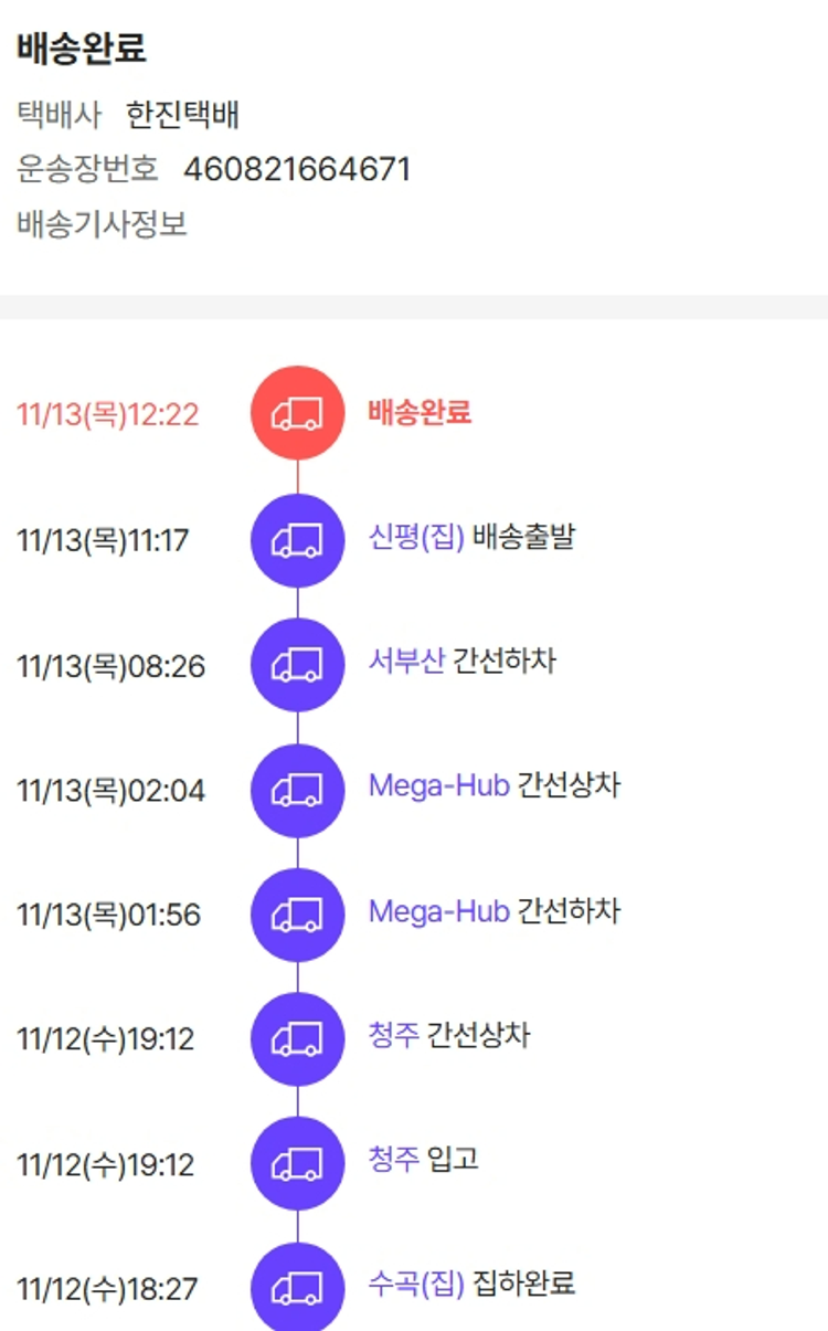 기부자님이 사용한 기부포인트 3,000원, 결제 수수료 10,866원, 기타 사업비는 행복나눔재단이 부담했습니다. (기부후기 발송시점에 최종 업데이트 됩니다.) 실제 쇼핑몰에서 확인되는 배송현황을 캡처한 내용입니다. 실시간 자료와는 차이가 있을 수 있습니다.