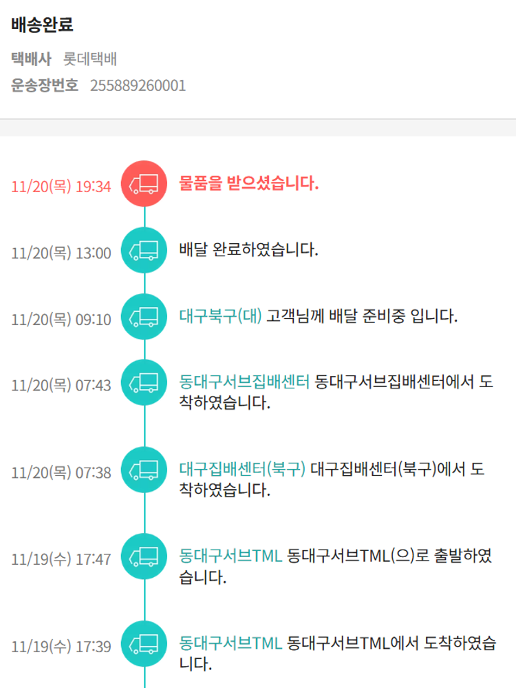 기부자님이 사용한 기부포인트 20,000원, 가격상승분 6,198원, 100원 미만 지원금 12원, 결제 수수료 13,518원, 기타 사업비는 행복나눔재단이 부담했습니다. (기부후기 발송시점에 최종 업데이트 됩니다.) 실제 쇼핑몰에서 확인되는 배송현황을 캡처한 내용입니다. 실시간 자료와는 차이가 있을 수 있습니다.