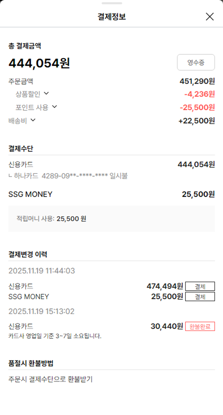 기부자님이 사용한 기부포인트 32,000원, 가격상승분 9,600원, 100원 미만 지원금 94원, SSG 머니 25,500포인트, 결제 수수료 12,939원, 기타 사업비는 행복나눔재단이 부담했습니다. (기부후기 발송시점에 최종 업데이트 됩니다.) 상품 주문 건 중 품절 발생하여 2025-11-24 재주문하였습니다. 실제 쇼핑몰에서 확인되는 배송현황을 캡처한 내용입니다. 실시간 자료와는 차이가 있을 수 있습니다.