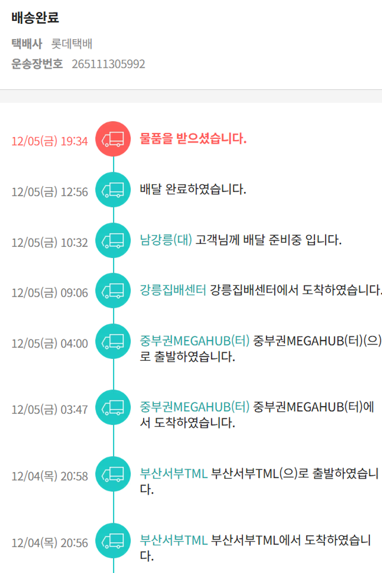 기부자님이 사용한 기부포인트 7,100원, 가격상승분 15,060원, 결제 수수료 10,463원, 기타 사업비는 행복나눔재단이 부담했습니다. (기부후기 발송시점에 최종 업데이트 됩니다.) 실제 쇼핑몰에서 확인되는 배송현황을 캡처한 내용입니다. 실시간 자료와는 차이가 있을 수 있습니다.