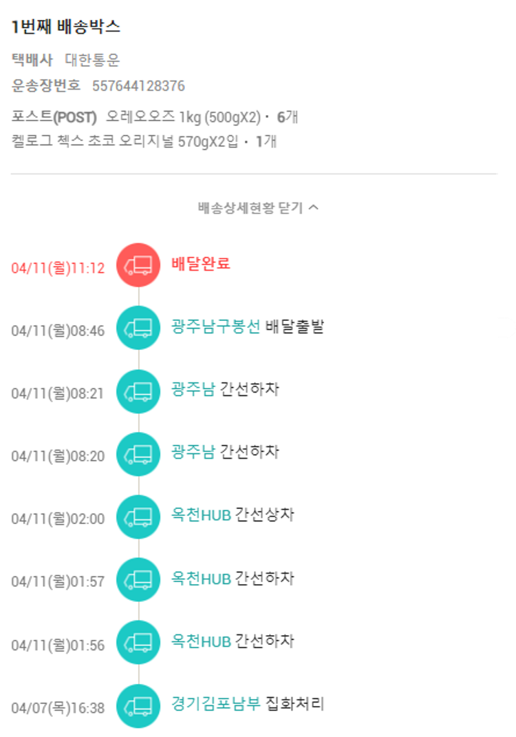 기부자님이 사용한 기부포인트 2,500원, 가격상승분 3,630원, 100원 미만 지원금 24원, 결제 수수료 11,053원, 기타 사업비는 행복나눔재단이 부담했습니다. (기부후기 발송시점에 최종 업데이트 됩니다.) 실제 쇼핑몰에서 확인되는 배송현황을 캡처한 내용입니다. 실시간 자료와는 차이가 있을 수 있습니다.