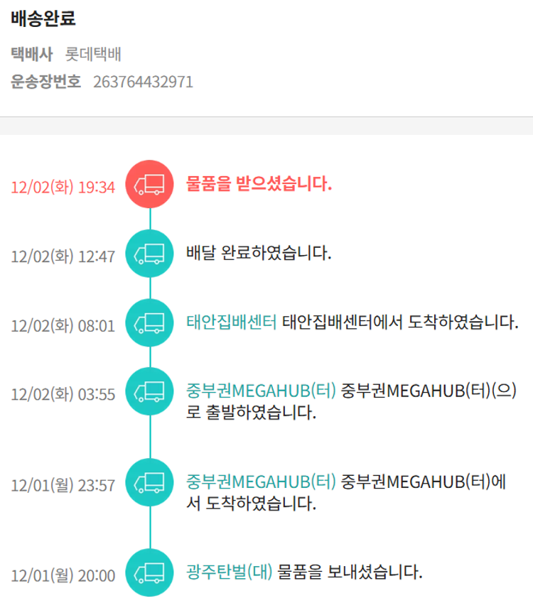 가격상승분 19,660원, 100원 미만 지원금 74원, 기타 사업비는 행복나눔재단이 부담했습니다. (기부후기 발송시점에 최종 업데이트 됩니다.) 상품 주문 건 중 품절 발생하여 2025-12-01 재주문하였습니다. 실제 쇼핑몰에서 확인되는 배송현황을 캡처한 내용입니다. 실시간 자료와는 차이가 있을 수 있습니다.